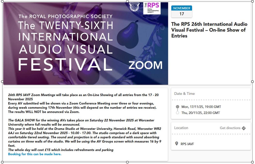 Booking is essential so Entrants, RPS AV Group members and all other attendees must book on line for record keeping purposes and to receive a link for the event.