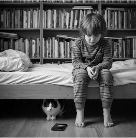 Left. An AI image. The intention was to comment on the fact that many children prefer to use a smartphone or tablet rather that read a book. The shelf is stacked with books but the child is upset because his phone is broken.