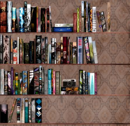 Another piece of work we started at in January was a project named Spines, book spines that is. At the end of each month every person in the group produced an image that gave a feeling, a summary or snippet of that month. The images had to have the ratio of a book we would find on our shelf, and we would stack them every month to build an image over a 12-month period. The image you see here is at the end of November so still a month to go. We are also now looking for a suitable background and some organisation of the books themselves will need to take place before we finalise the image along with some embellishments, we do have a camera in there, but we need more.