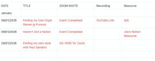 The Notion page provides you with the workshop details and the Zoom link. It is where you will find any resources the tutor provides. Plus post event it is where you will find the recording.