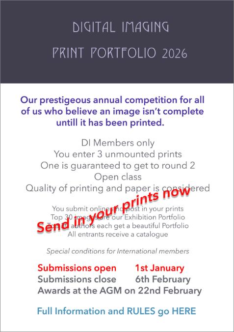 There’s plenty to look forward to — our AGM, Print Portfolio entries, a Keynote speech from our new CEO and the launch of an exciting new series of workshops designed to stretch your creativity and expand your skills. Lots of opportunities to fill those blank pages of your new diary and to lift the gloom of these wet and windy days that have ushered in the start of 2026. Enjoy.