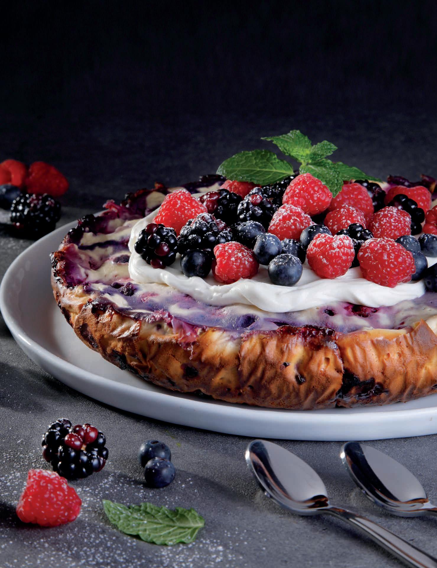 1 tazas de moras 2 cucharadas de manteca PARA EL BETÚN: 300 gramos de queso crema ½ taza de azúcar PARA DECORAR Frutos rojos 2 cucharadas de azúcar impalpable Hojas de menta fresca PARA EL ALMÍBAR: