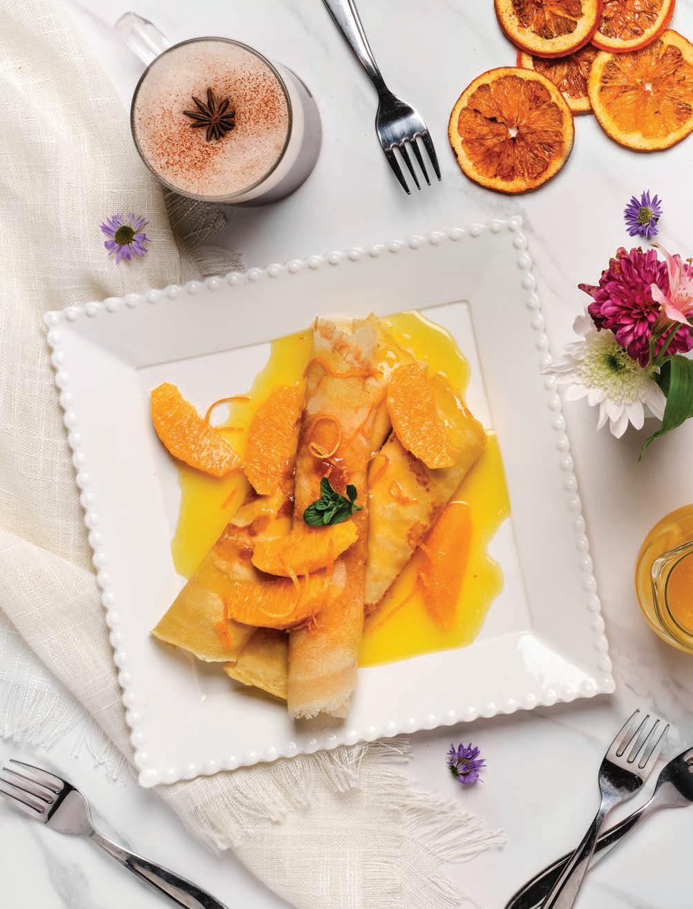 7 Baña las crepas con la salsa y sirve con supremas de naranja.