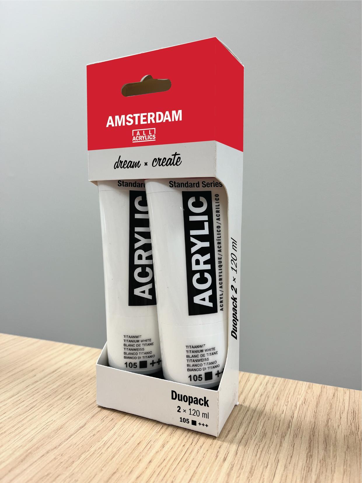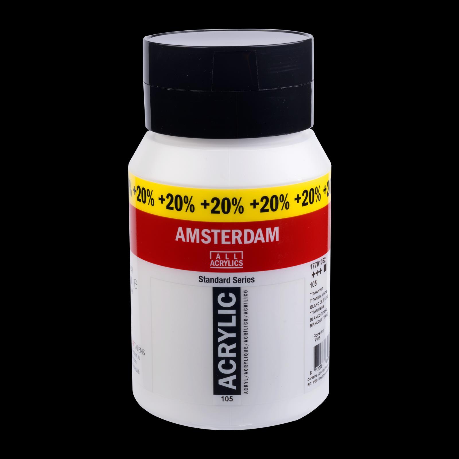 • Amsterdam Standard Series acrylic paint in Titanium White (105) is an opaque color with an excellent lightfastness (+++).