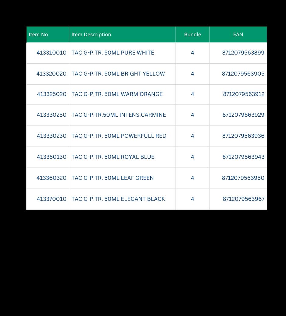 • Textile Opaque is specifically developed for dark coloured fabrics and is available in 6 colours.