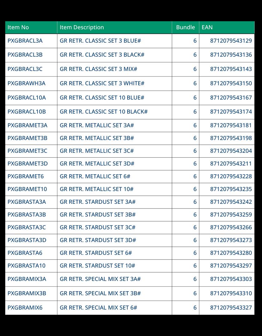 • Great selection of colours, available in 21 sets of 3, 6 and 10.