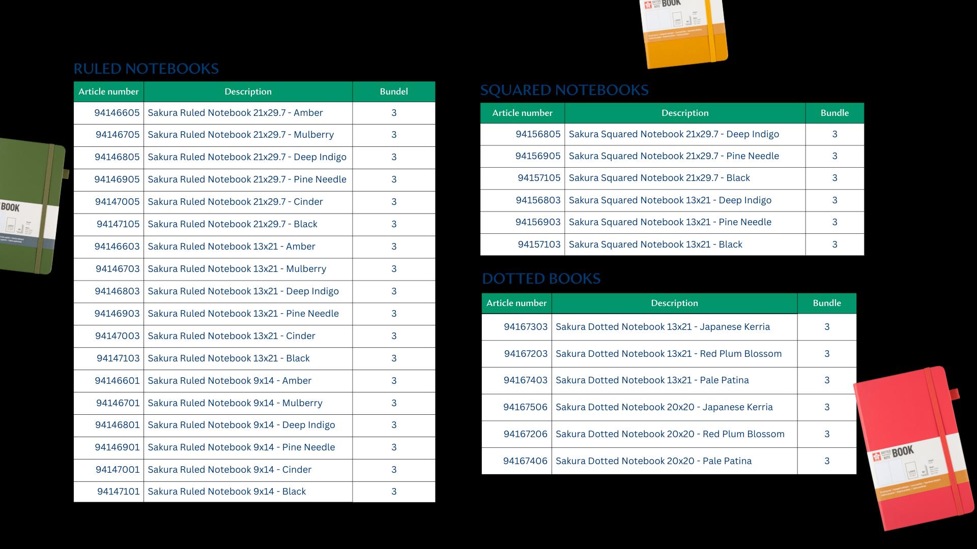 • Total of 30 notebooks divided in 9 different colours, 3 different sizes, and 3 types of paper.
