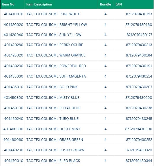 • Textile is a paint for light-coloured fabrics (at least 50% cotton) and is available in 15 colours.