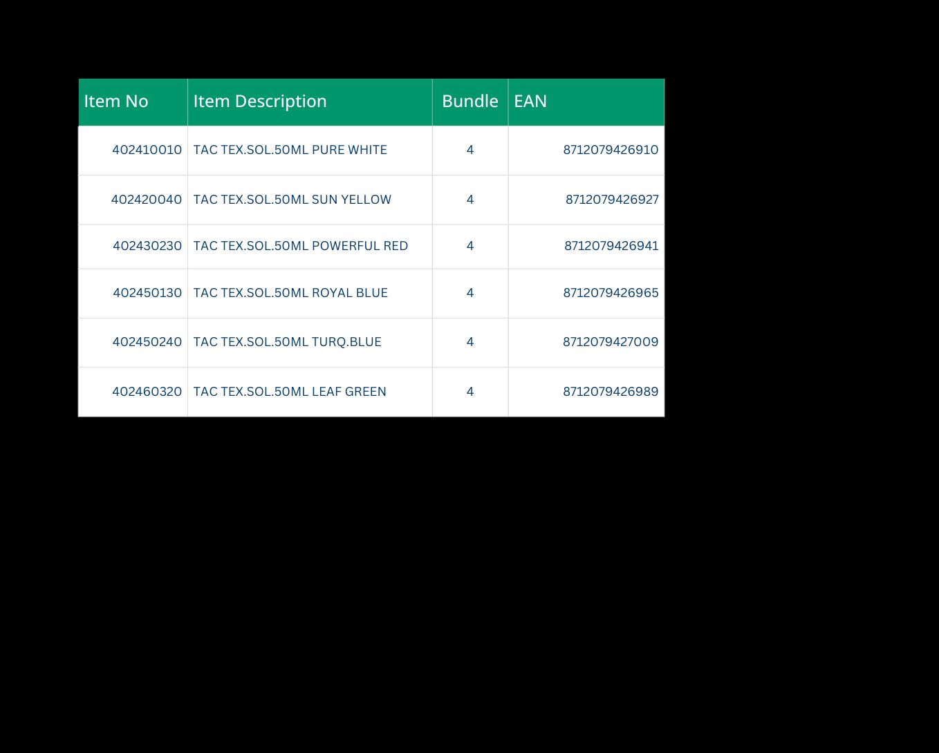• Textile Paints: Regular (15 colors) and Opaque (6 colors) in 50 ml jars.