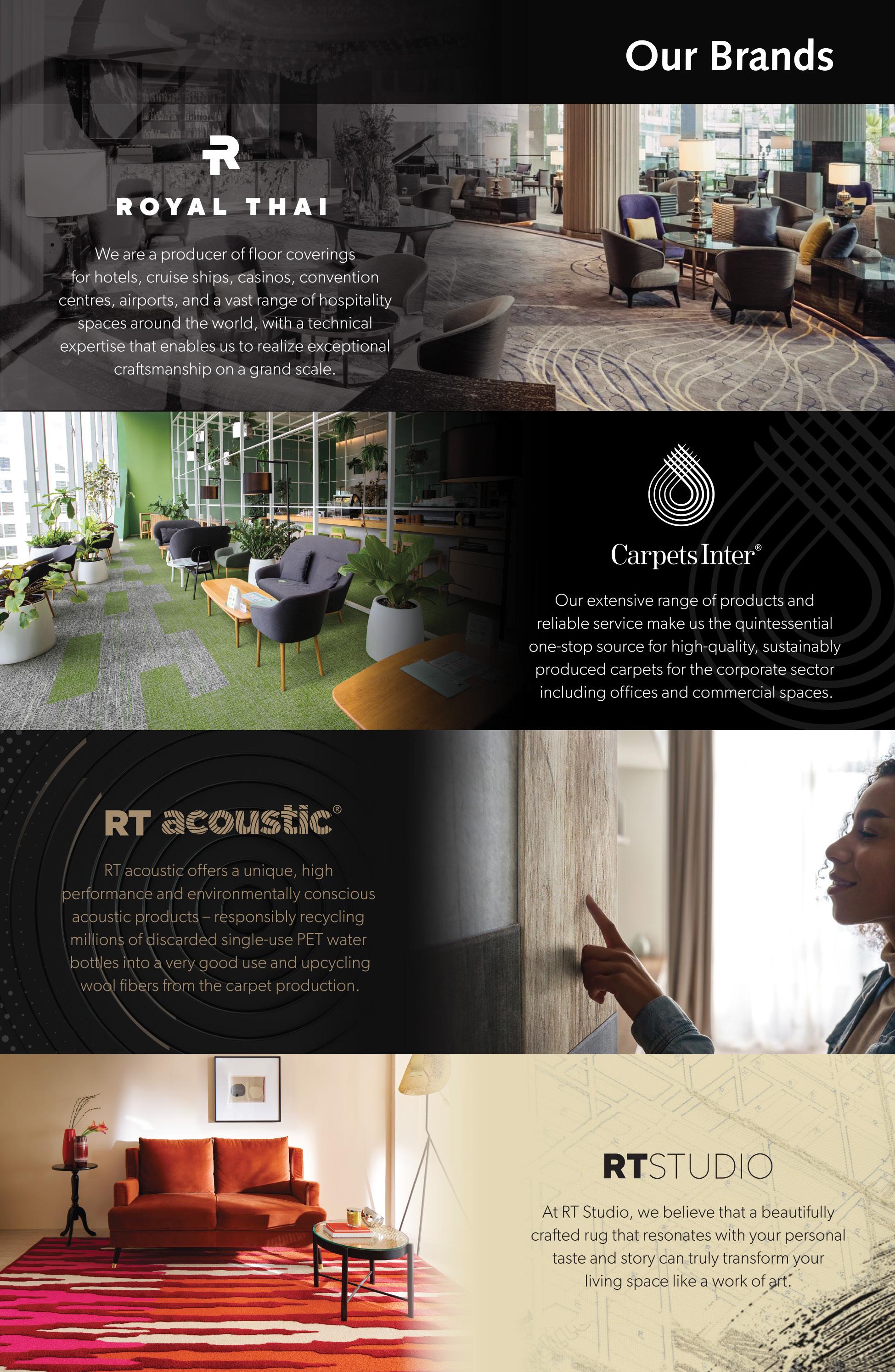 Royal Thai strengthened its position as an industry leader by combining its activities into a cutting-edge 100 Rai facility in Pathumthani. This strategic decision streamlined production and prepared the organization for future expansion. Today, our brands—Royal Thai, Carpets Inter, RT Acoustic, and RT Studio—represent our rich legacy, devotion to innovation, and dedication to delivering excellent flooring solutions that enrich environments throughout the world.