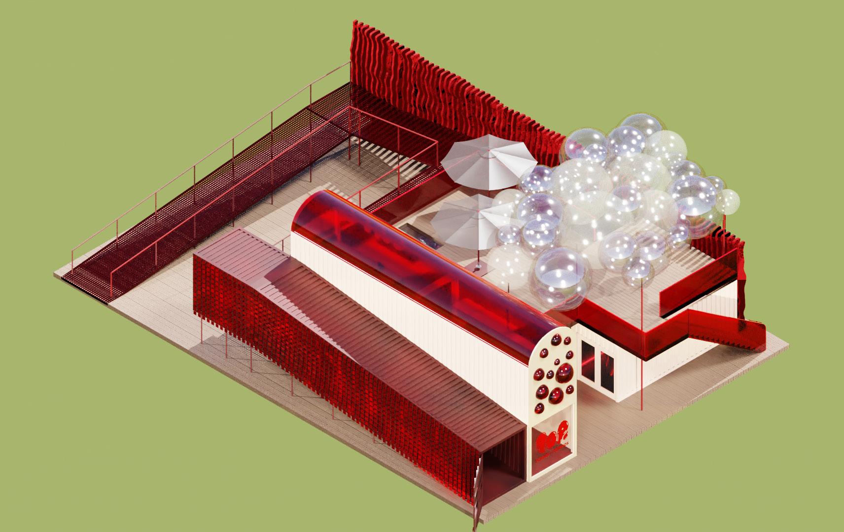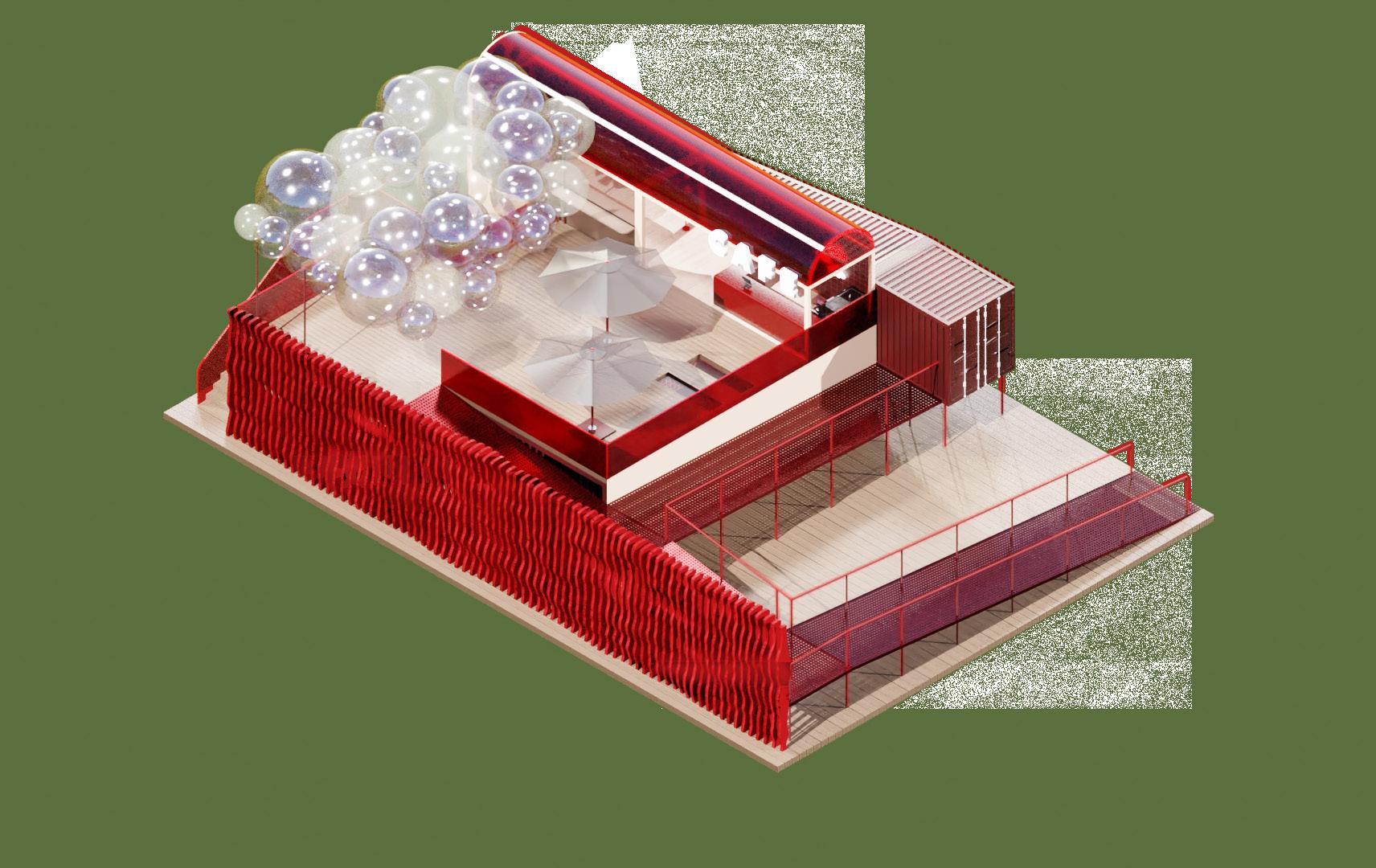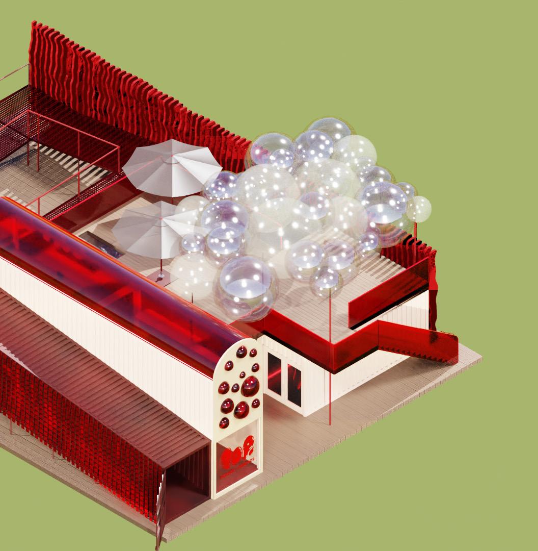 varying sized bubble ‘windows’ protrude from the building facade on the cafe level, plexiglass is also used for the stair and balustrade as well as the cafe arched roof