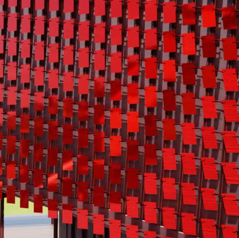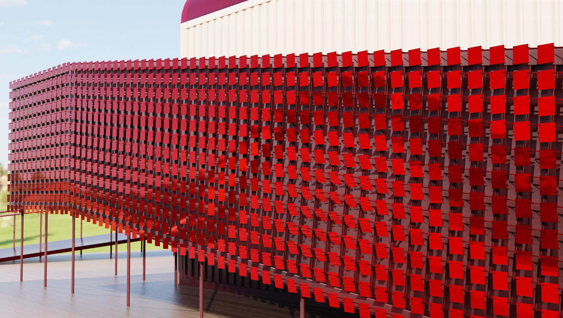 individual panels connect using pin and rail system, move with the wind to create a visual effect and also create a rattling noise