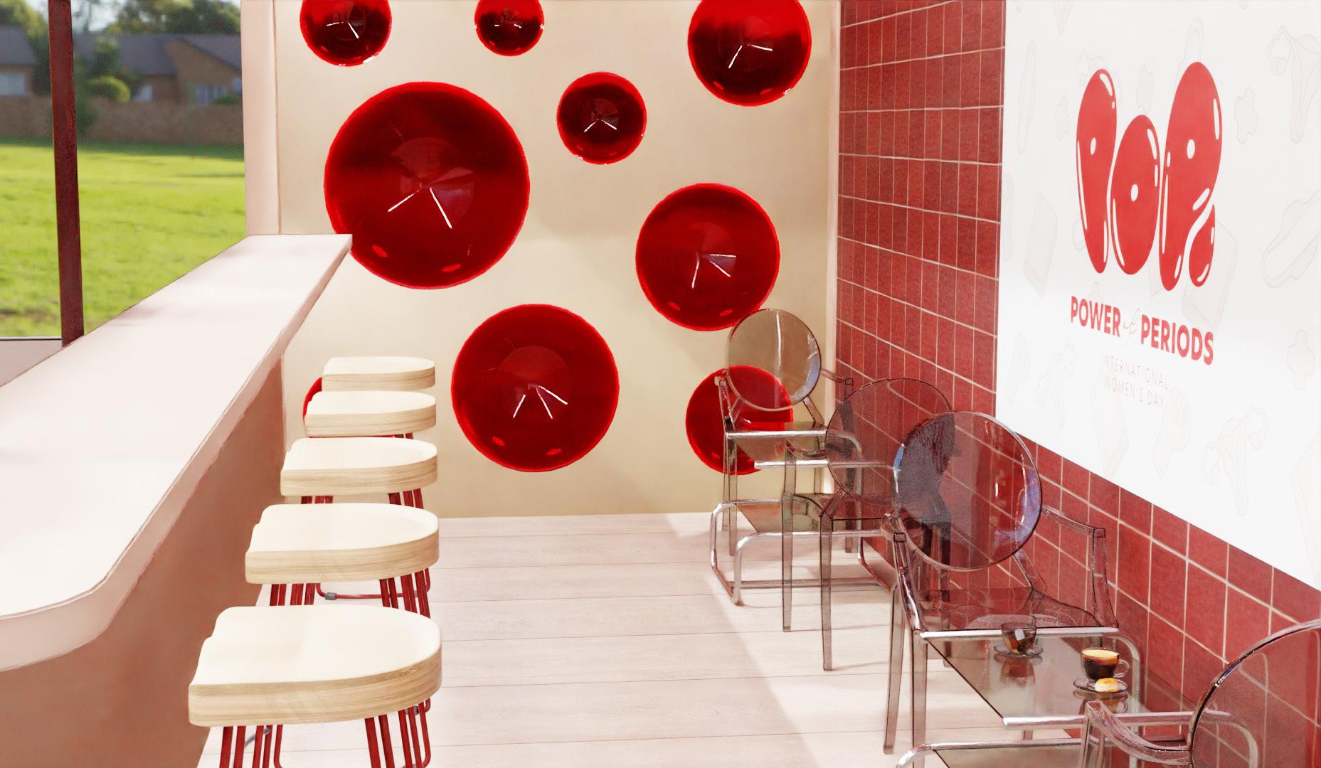 ‘Pop’ is a multi-sensory pop-up exhibition designed in response to the concerning poor menstrual health literacy of young and adolescent women in Australia. The exhibition is free and open to all with the intention to educate, empower and engage its visitors. Combining public art, craftivism and temporary architecture, ‘POP’ also doubles as a promotional event to celebrate and raise awareness for menstruation and education during the month of International Women’s Day (March 8th). The pop-up boasts a themed café and merchandise shop, as well as the immersive exhibition featuring original craft, and artwork such as paintings, installations and posters and more.