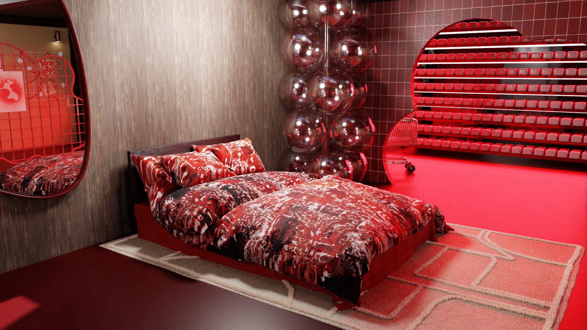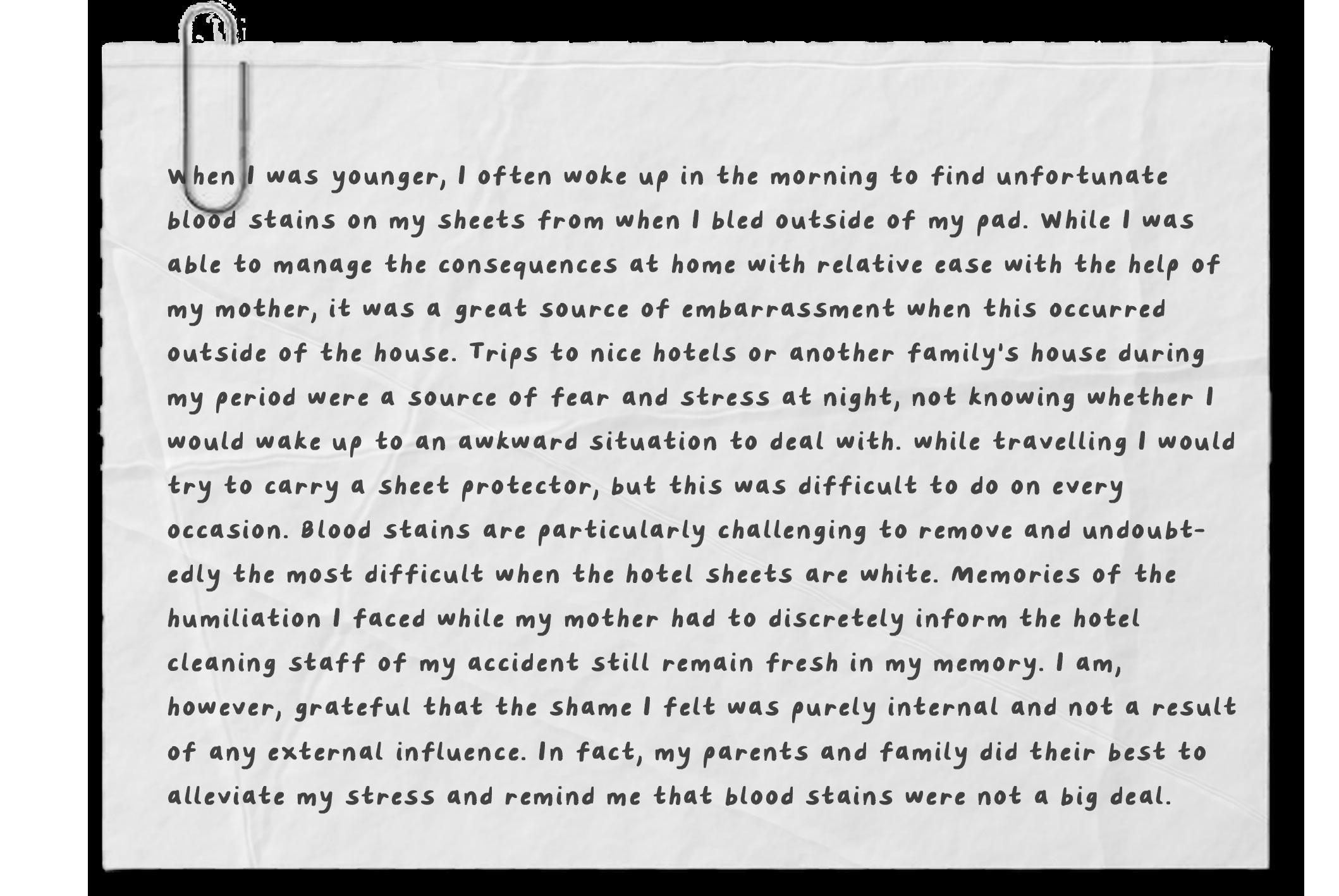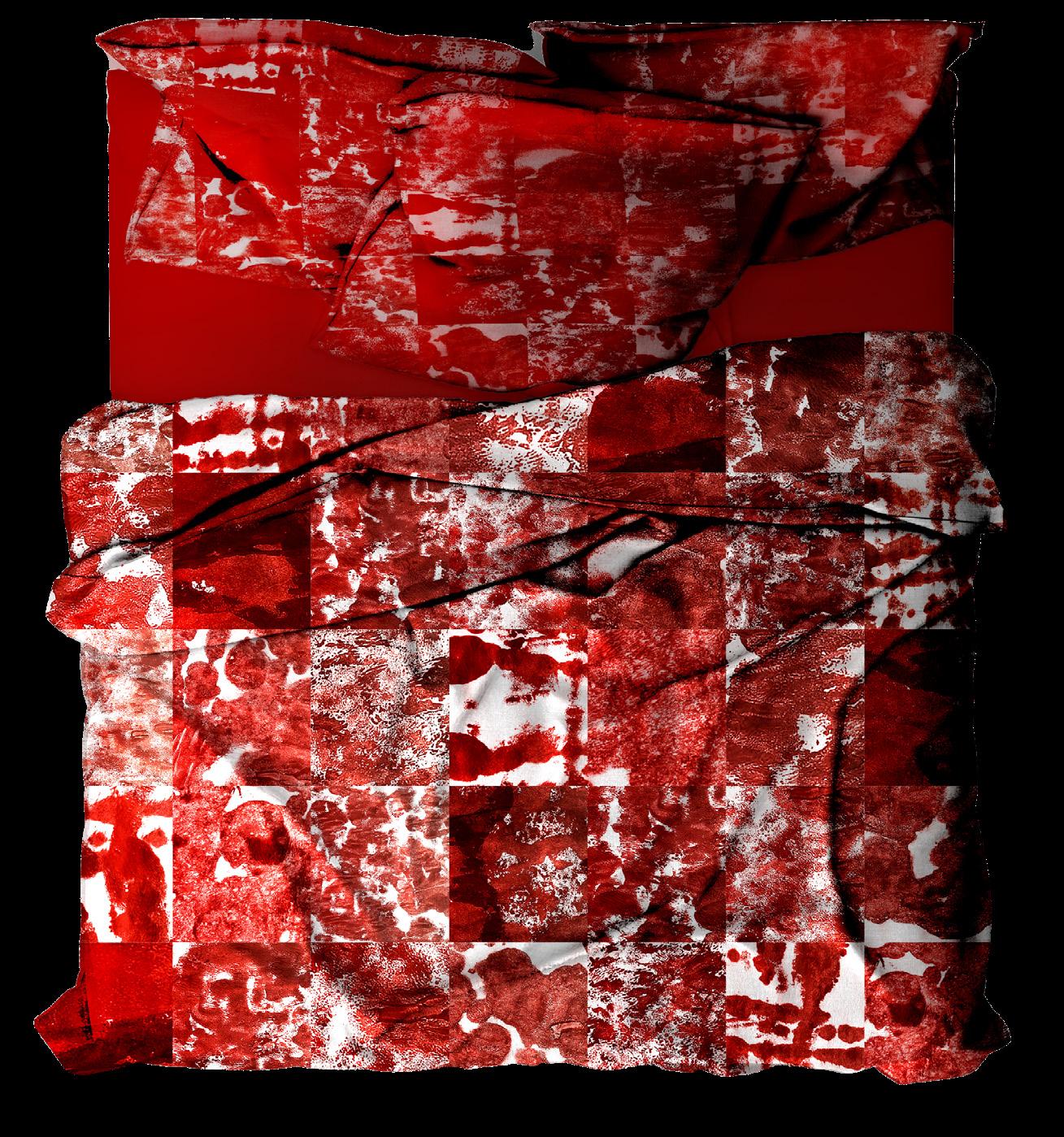 The quilt design on the bed forms one part of the exhibit and reflects a bedroom environment. The white rug underneath the bed supports the ideas of stains and the fear of showing period stains in public.