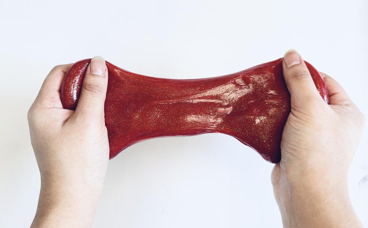 In this view the slime and playdough interaction table can be seen which faces a glass wall facing the entrance. Example posters created are displayed on either side of the bespoke dislay stand and uterus flags are displayed on the back wall. The entrance to the next space can also be seen.