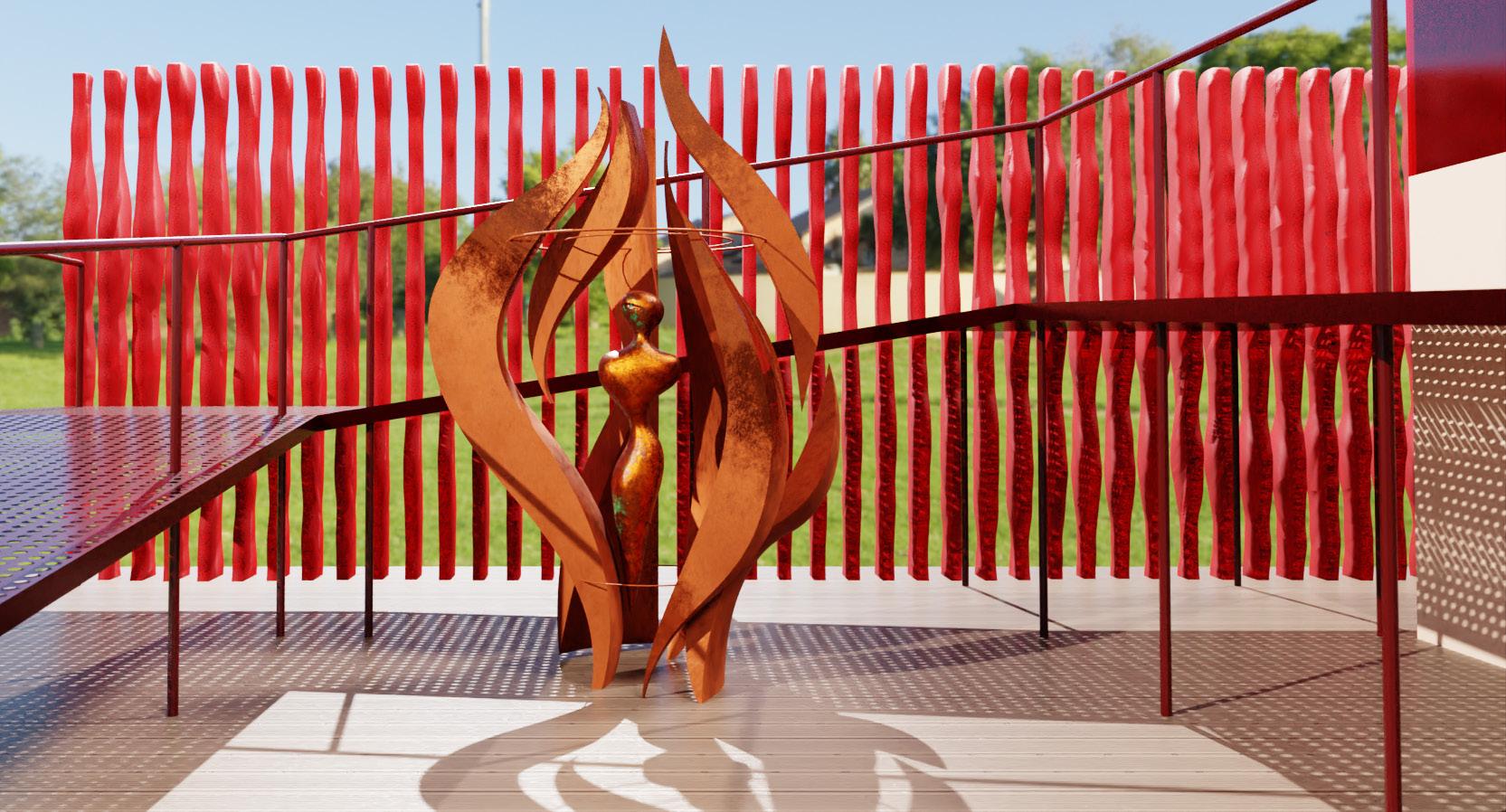 Outdoor exhibition item, a copper metal sculpture that as it oxidises releases a subtle smell that is similar to blood. Shape of sculpture inspired by shape of the exterior of the female reproductive organ.