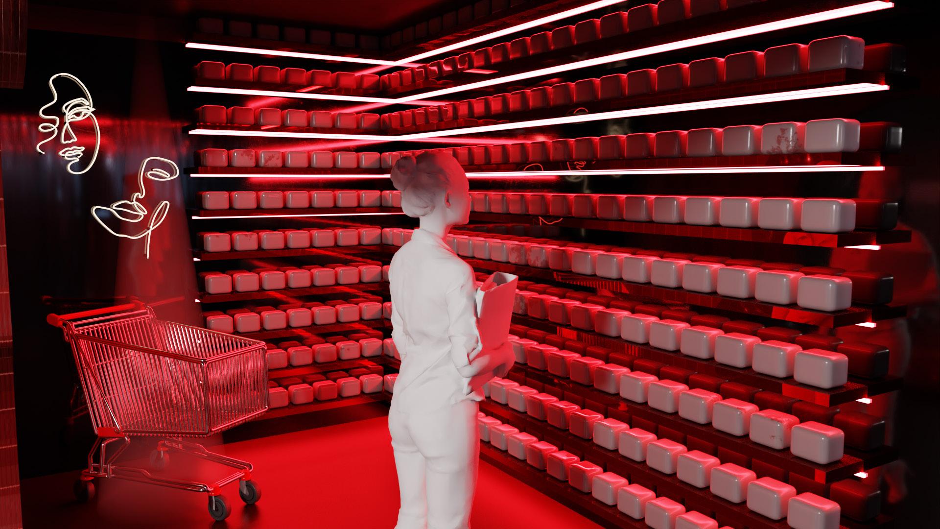 Shopping wall lined with period products packages as well as empty shopping cart represents another place where individuals who mesntruate experience menstrual encounters.