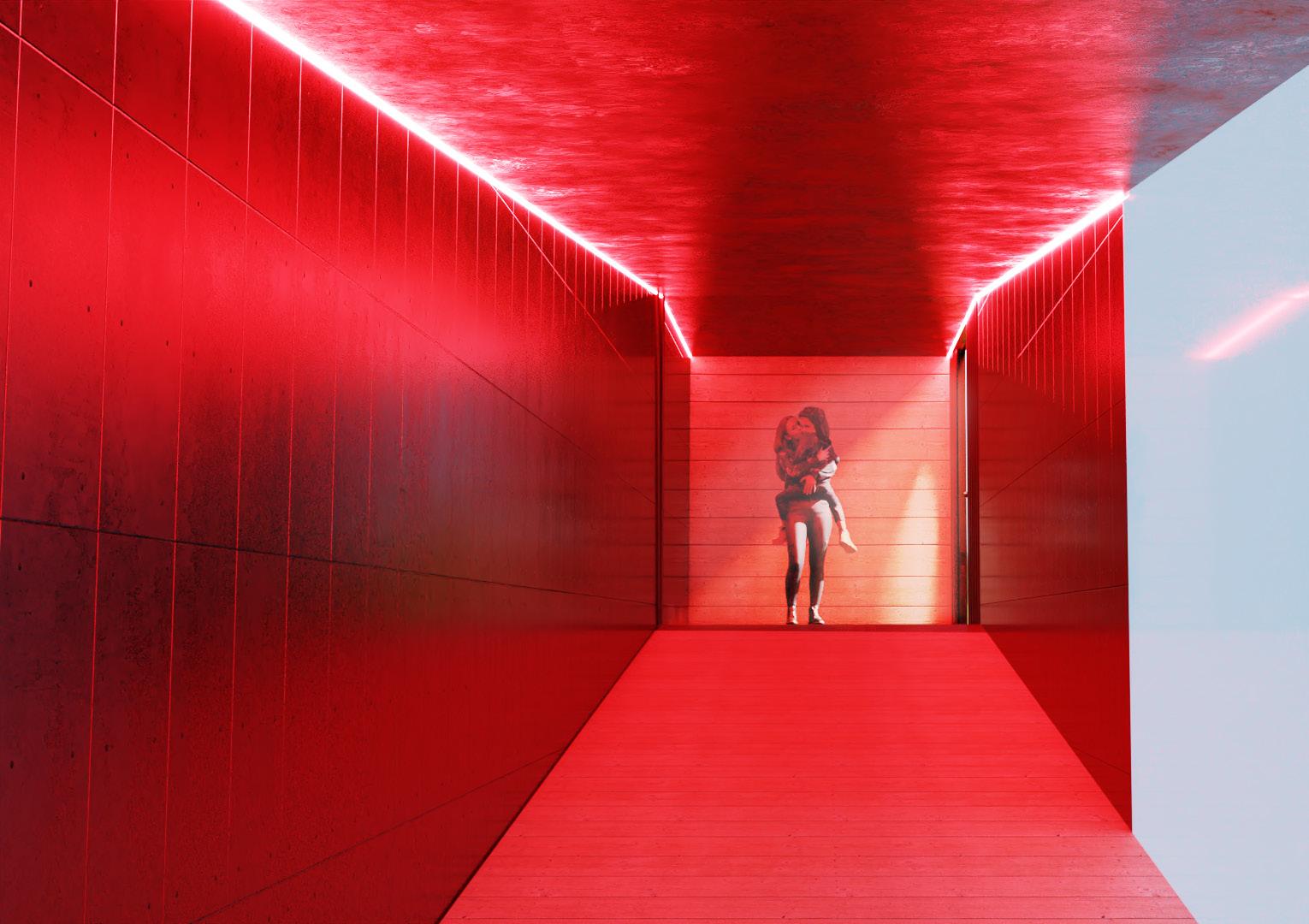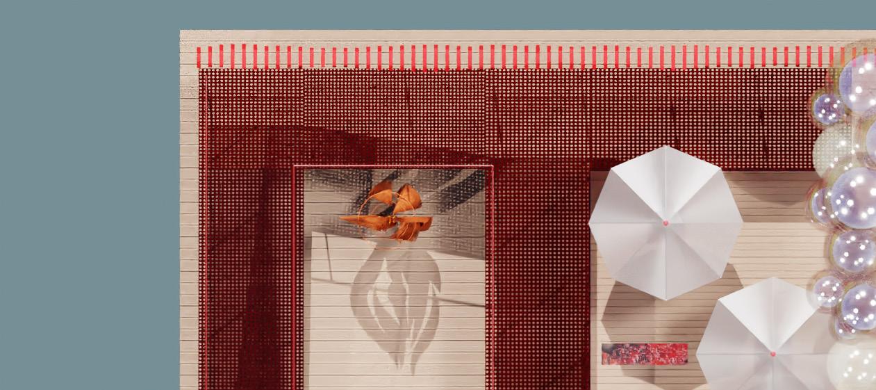 perforated metal mesh mesh used for the ramps continue ideas of transparency throughout the exhibition, allow for light to plass through the outdoor exhibition part