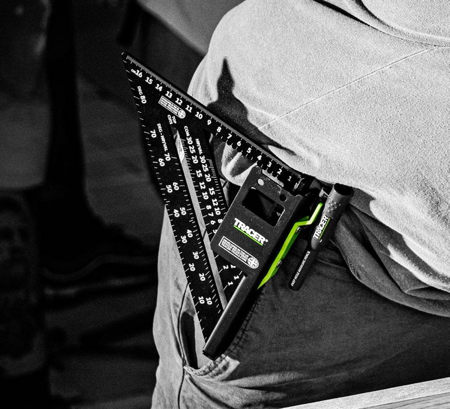 In addition, we have the TRACER Metal Square Tool Holster. This holster delivers convenient onsite storage of square tools, tape measures and TRACER Markers. The holster has been crafted to be hold most common square tools sized up to 150mm / 7’’. It is built with multiple fastening locations for additional tools and has a reversible design that can be equipped on either hip.