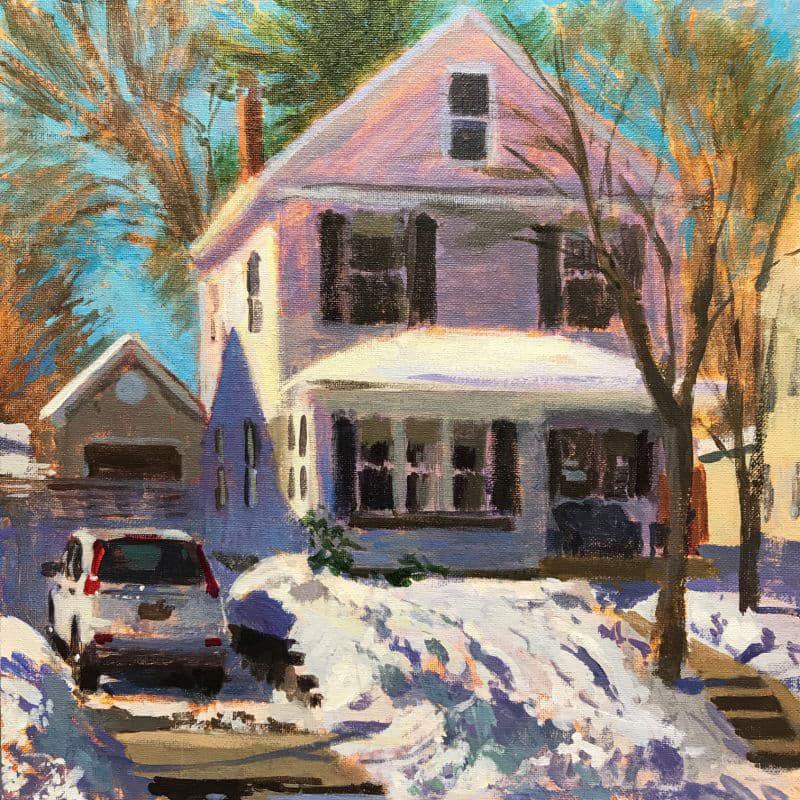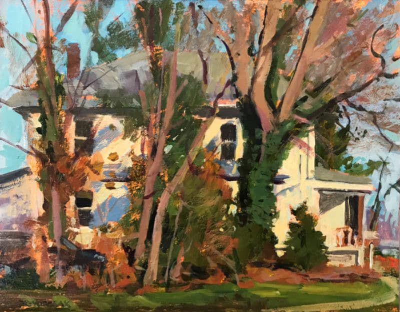 I had my eye on this house as a painting subject for a long time. Figuring the time of year and time of day that best revealed part of the house through the line of trees took some time. It proved to be a wonderful subject in the late fall when the brush and foliage still had color but did not overtake the morning light on the white house peeking through here and there.