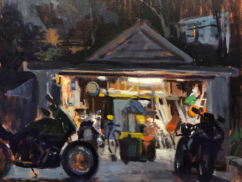 One night I was looking over my neighbor’s fence and I happened to see his garage had this wonderful glow on all his clutter. The scene was contrasted by two of his motorcycles which were silhouetted in shadow in the foreground. The glow of the night and the artificial light of the garage proved to be a very unique composition and painting challenge!