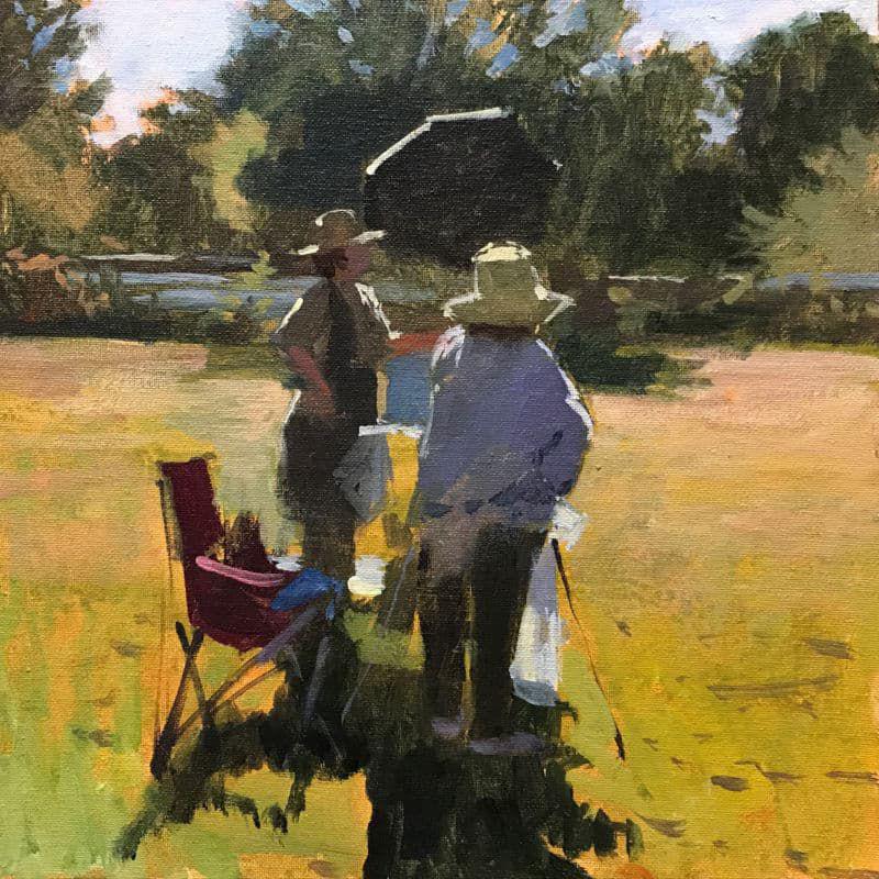 During one of my workshops, I saw two students painting together as the light highlighted their umbrella, hats and painting accessories. The light, composition and color were so intoxicating I could not resist getting it down in paint!
