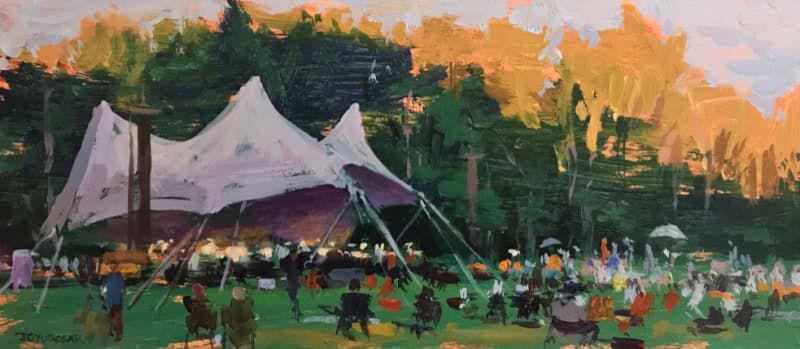 I was standing in a field watching and waiting for the Virginia Symphony to arrive for an evening of beautiful music and a voice in my head said, “Don’t wait! Start painting!” I listened to that voice and then good things started to happen; the glow of the evening was upon us. Once the music started, my brushwork became invigorated. Letting our intuition lead us can drive creativity to new heights!