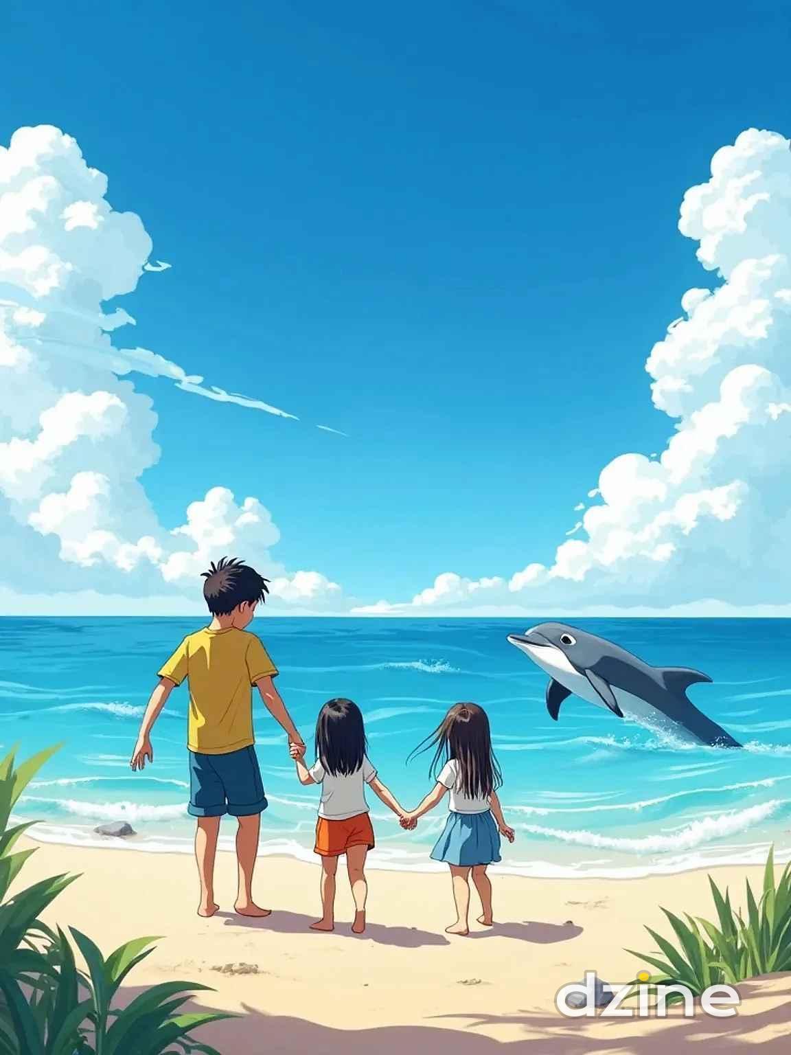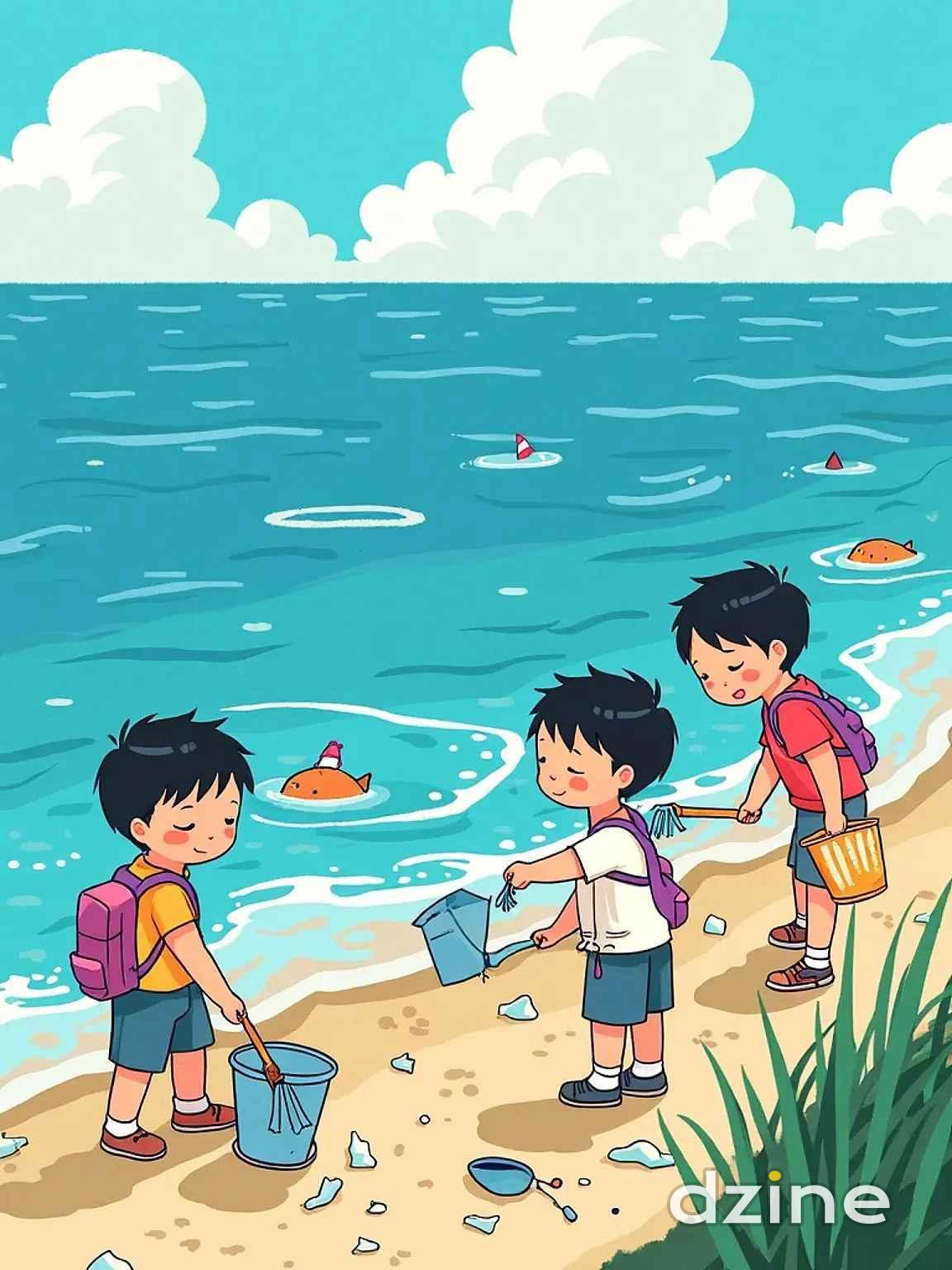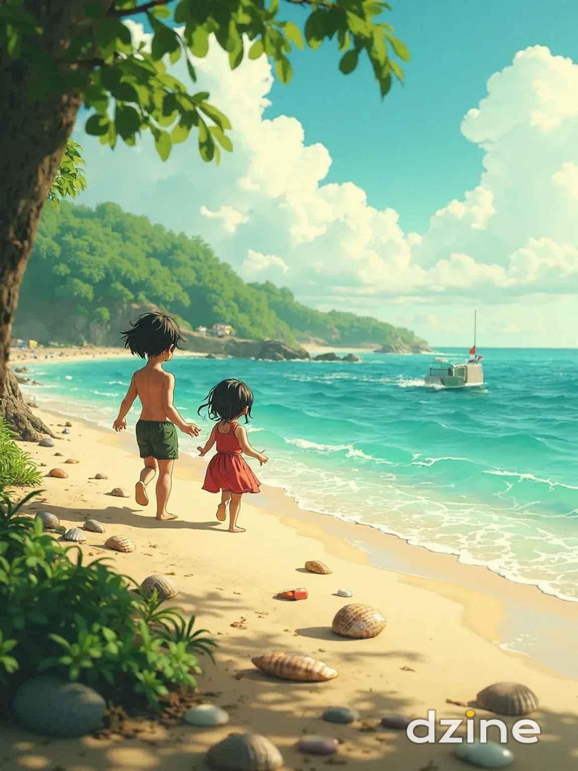 最終,他們來到一片平靜的海灘,沙灘上堆滿了 貝殼和海藻,孩子們在岸邊追逐著海浪,快樂地笑 著。