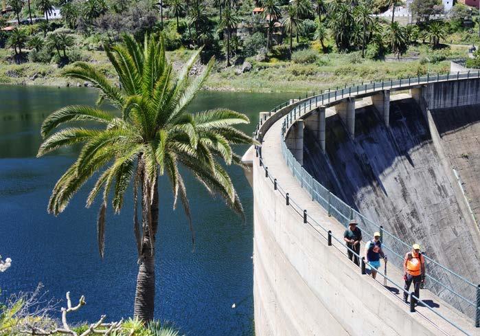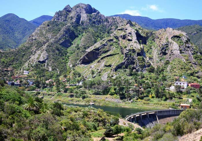 Sortim de la presa d'Amalahuige i seguirem el GR-132 fins a Vallehermoso i el GR-131 fins al final d'etapa. Seguim la pressa, pràcticament buida, un petit tram, però el GR, ràpidament la deixa i ens enfila cap a l'interior del bosc amb una pujada continuada però suau. El camí, com quasi sempre, molt cuidat. La vegetació comença a ser bosc de laurisilva. Arribarem al Roque Chico i al Roque Cano, aquest darrer impressionant i visible des de molts punts, principalment des de Vallehermoso. Sembla que té diverses vies d'escalada. Nosaltres hi trobem uns escaladors de Terrassa. Ara baixarem amb forta baixada fins a Vallehermoso. Agafem el GR-131 i pels extres barris, amb una forta pendent cap a la presa La Encantadora. En aquest tros el camí s'espatlla una mica. La presa és plena a vessar i molt bonica. Seguirem un tram per una carretera fins que el GR ens desvia cap al mig del bosc amb una forta pujada que pràcticament durarà fins al final. En aquest tram, cada certa distància, hi ha col·locades unes travesses rodones que les pluges han convertit en unes escales prou curioses. Seguint aquesta tònica de pujades i més pujades i entre-