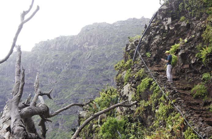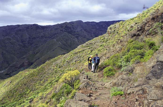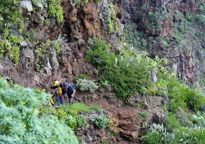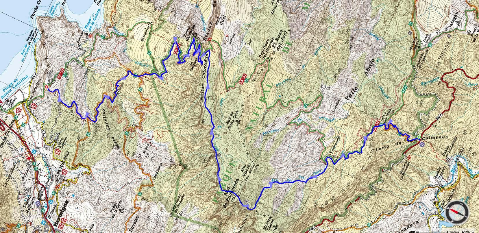de l'altura i de la situació. El camí que seguim és una pista fins a arribar a l'Encherada, antiga masia ara abandonada. Aquí agafarem una pista secundària que antigament havia estat un GR. La pista es converteix en un corriol que puja fort fins al Alto de la Enchereda. Abans d'arribar-hi trobarem trams amb uns petits graons tallats a la roca que són els únics que presenten una certa dificultat. En els últims trams gaudirem d'una gran vista d'Hermigua. A l'hora de baixar ho fem per un sender prou evident i tortuós que ens portarà, altre cop, a la pista GR-132 fins al Roque Garaballo, que seria final d'etapa, però, per les raons ja explicades, continuem. Hem quedat amb en Carlos que hem de passar pel Palmar. El caminet que baixa al Palmar està totalment desaparegut sota una vegetació que ens arriba al pit. Sort dels GPS per fer aquest tros. A partir d'aquí, seguim l'itinerari 33 que ens portarà a la carretera enquitranada que porta a la Playa de la Caleta. Quan hi arribem ens comenten que l'itinerari millor és seguir la pista, que encara que és més llarga i una mica més de desnivell, és més ràpida i ens porta al punt de sortida de la pròxima etapa. Rectifico track i marco aquesta.