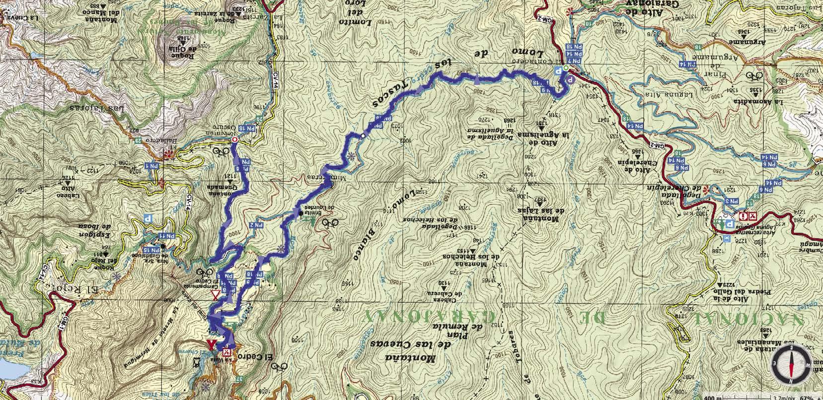 Busquem amunt i avall i no trobem res. Mirem indicadors i no en trobem cap. Decidim tirar amunt per una carretera empedrada fins a arribar al Reventón Oscuro, final d'etapa.