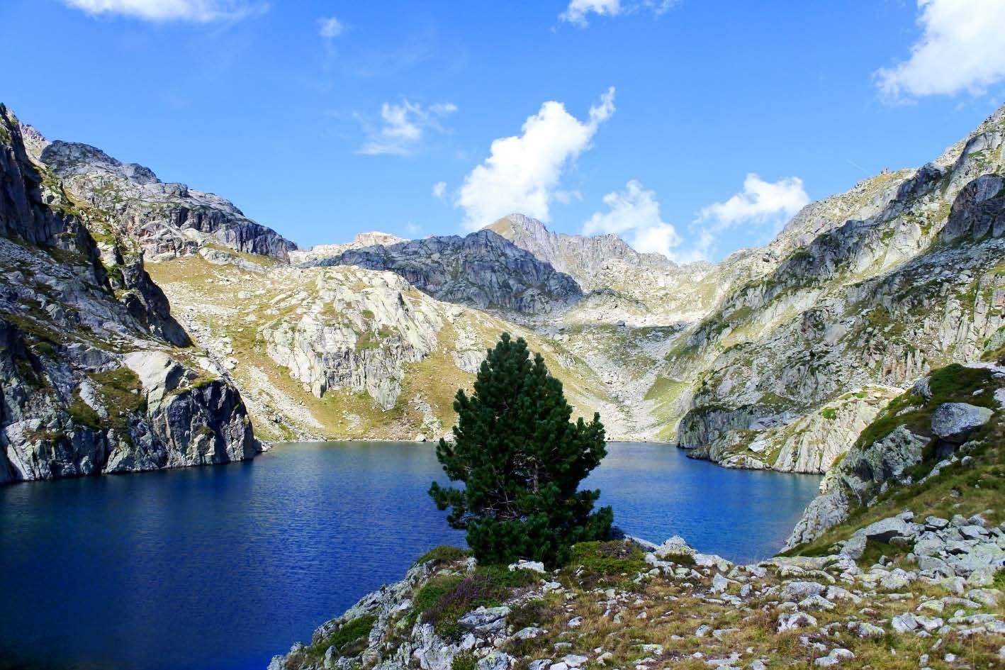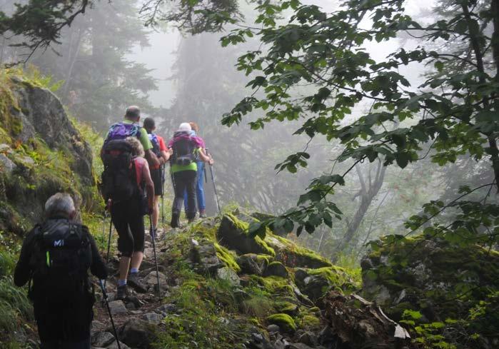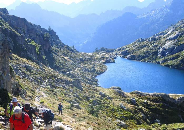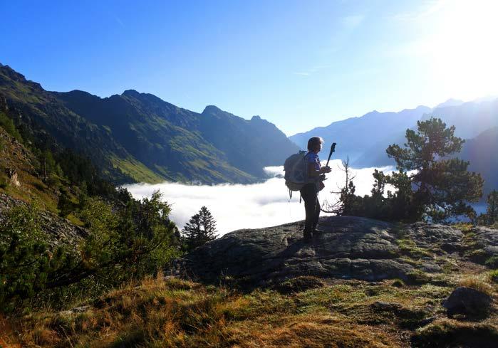 cabalós rierol i adornades amb pins i moixeres de guilla eren un decorat idíl·lic, fins arribar al pont de Cayan que serveix per passar la riera de Mercadau i començar a guanyar alçada per un estret camí .Al fer-ho, les boires varen anar quedant a sota nostre formant un espès mar de núvols, que provocava un irrefrenable desig de fotografiar-ho tot. Un preciós dia embellia encara mes el paisatge (Sant Bernat, sabia que anàvem a pujar un cim amb el seu nom?) I ens acompanyava en la recerca, primer dels tres llacs d’Embarrat i fins el del Portet, aquí el camí deixava d’allunyar-se del punt de partida i començava a girar cap a l’esquerra. Petita parada per reposar forces, foto de grup i seguíem camí per descobrir nous racons, fins arribar al punt on segons el previst havíem de deixar el camí per enfilar-nos cap el Bernat Barrau, un cim no massa conegut, però que presentava unes xifres que el feien respectable: amb un quilòmetre i mig mes o menys havíem de pujar cinc cents metres de desnivell positiu. En aquest punt, tres companys varen decidir seguir el camí cap el refugi del Wallon i esperar-nos i dinar allà. Els demés continuàvem amunt, fins el llac de Bassià (150 m amunt), aquí dues companyes decidien esperar que féssim l’últim esforç de 350 m que quedaven fins el cim