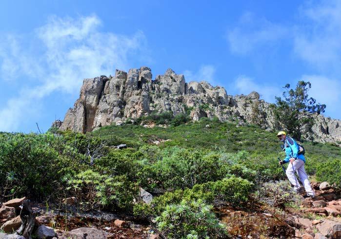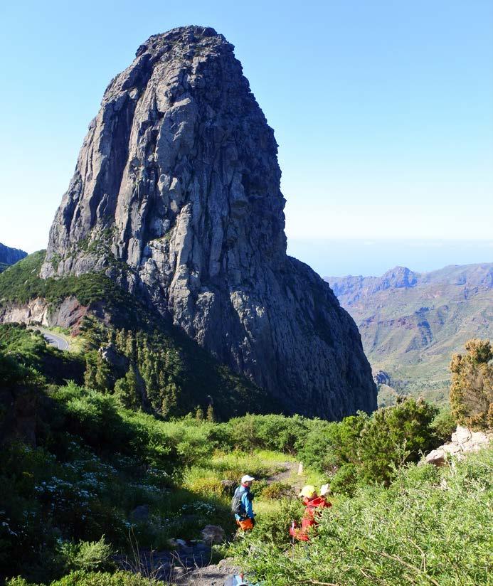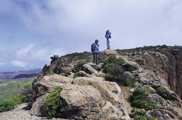 Avui sortim de Chipude. Estem a 1050 metres d'altura i sortim abrigats, tot i que després haurem de treure'ns una mica de roba. El camí és molt bo i voreja el costat de la carretera. Arribem a la cruïlla de La Fortaleza, que és un castell natural que destaca a la llunyania. En Carlos ens explica que aquí varen resistir els últims defensors de l'Illa contra les tropes espanyoles i que hi ha tombes en la part més inaccessible de La Fortaleza. La pujada és dura i a la part final cal anar molt amb compte, ja que una relliscada pot tenir greus conseqüències. Donem tota la volta amb unes vistes espectaculars. Baixem i continuem pel GR i enfilem una pujada no molt forta encara que constant i en trams envoltats pel pi canari. En arribar al barranc de la Tranquilla el GR puja amb un bon desnivell. El camí continua essent bo. Arribem a una pista que ens porta al Mirador de Igualero, amb vistes de tota la vall. Fins aquí hi arriba la CV-17. La seguim un tram i el GR ens enfila cap l'Alto de Garajonay. Primer amb una forta pujada i després amb un tram més planer. L'últim tram el fem per una carretera empedrada que puja fins a l'Alto de Garajonay que