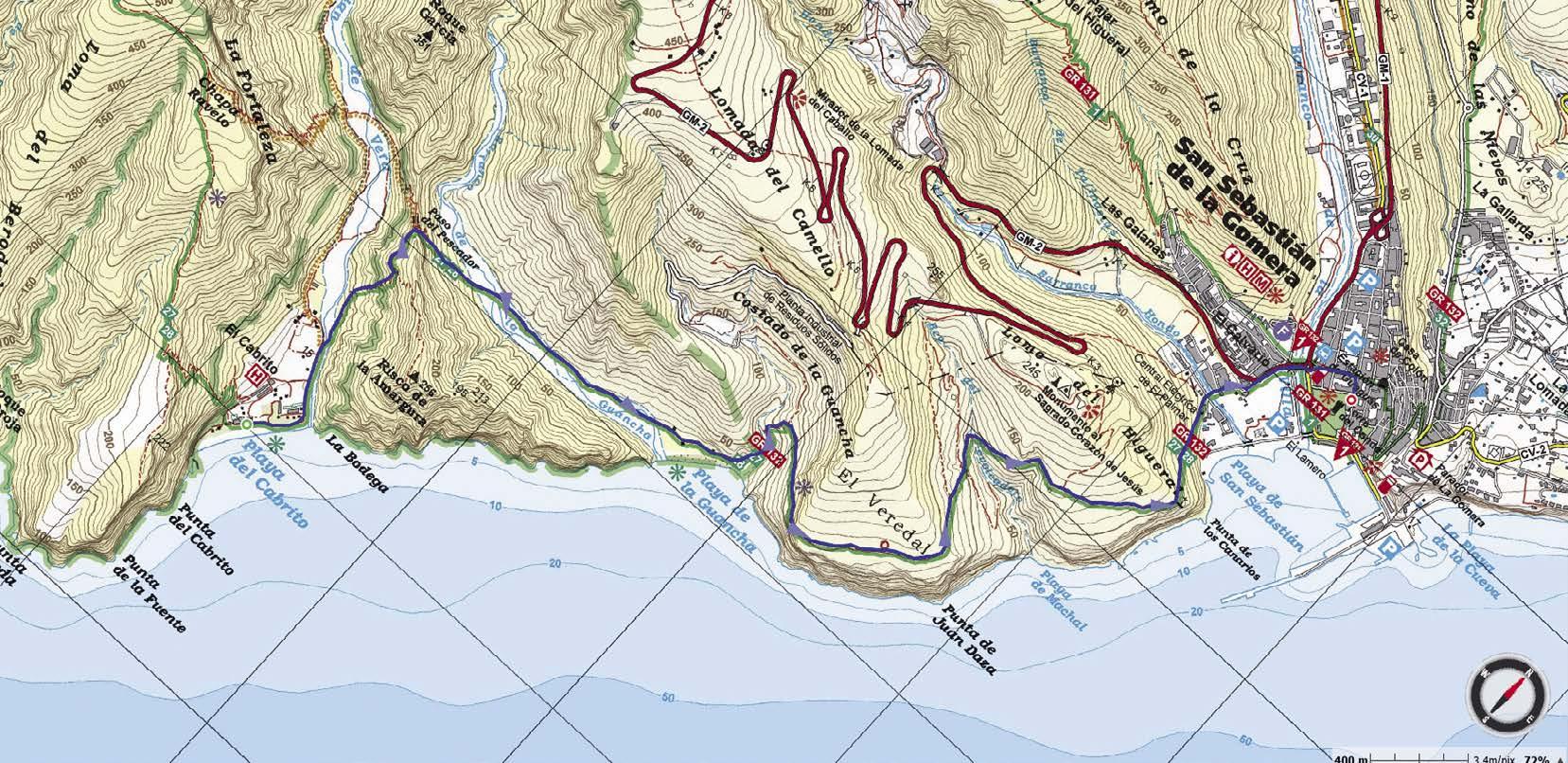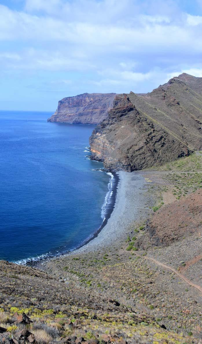 Iniciem la marxa a la Playa del Cabrito, platja que es prou difícil banyar-s'hi. Avui seguirem el GR-132 fins a San Sebastián de la Gomera. Els camins, com quasi sempre, de bon fer. El primer tros es fa seguint el Barranco del Cabrito, molt planer. Després, una pujada amb fort desnivell ens porta al Paso del Pescador. Ara toca baixar el camí que, amb unes fortes revirades, ens porta a El Barranco de la Guancha. A continuació, tot planer fins a la platja. Passarem per una solitària caseta i ens tornarem a enfilar fins a El Veredal i amb uns lleugers puja i baixa farem l'última baixada fins a San Sebastián de la Gomera. Durant tota la ruta gaudirem d'unes vistes del mar excepcionals.
