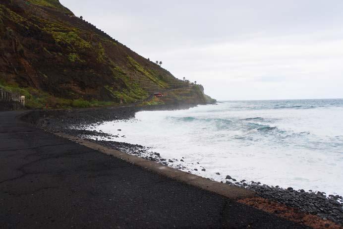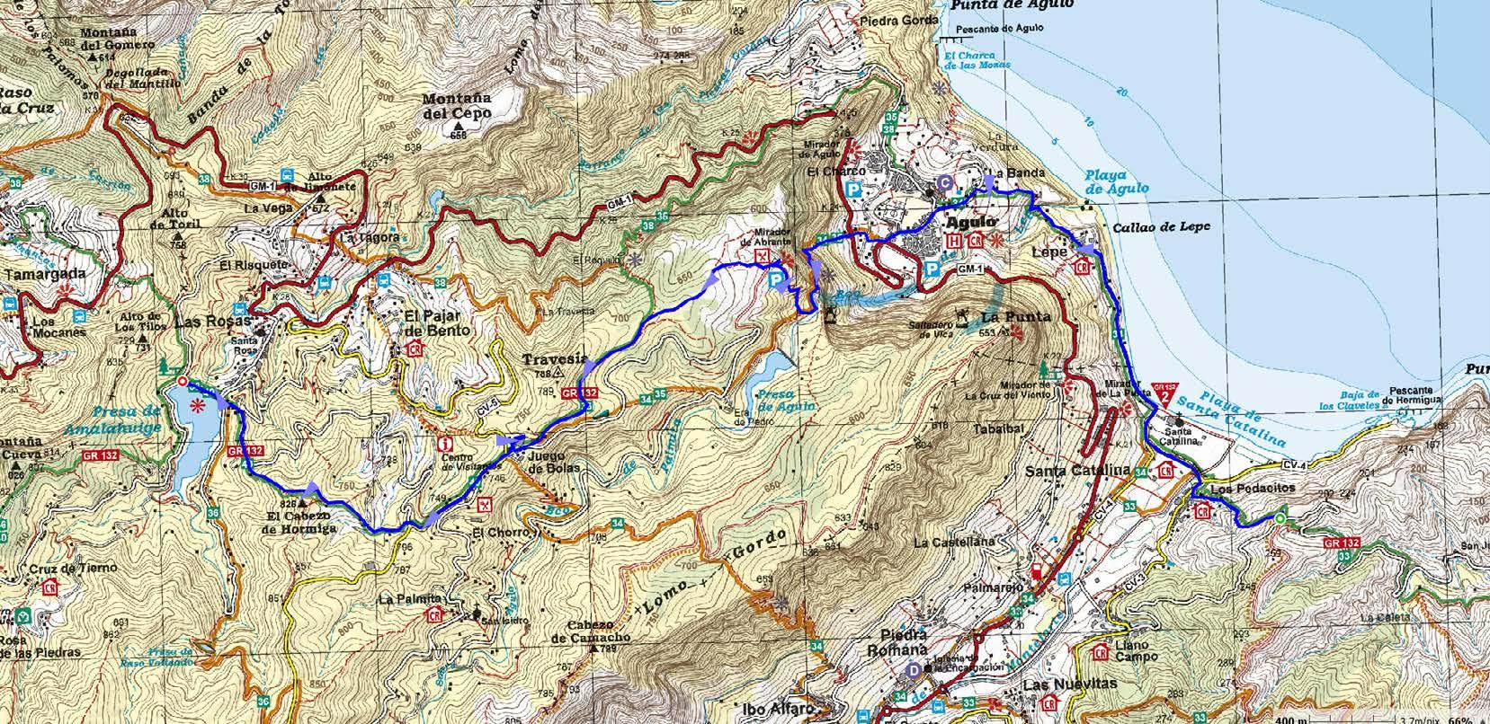 En llevar-nos al matí plou. Hem deixat un dia de lleure, però ferlo servir al segon dia no és lògic. Ens comenta en Carlos que baixem fins a la platja de Santa Catalina i que si allà plou ens ho plantegem. Efectivament a la platja no hi plou. Hem de decidir si comencem aquí o si amb el taxi donem una bona volta per anar al punt original de sortida. Decidim sortir d'aquí, però deixo marcat la sortida original a uns 800 metres. Seguirem la ruta 34 que comença vora mar. El nostre Mediterrani, comparat amb l'Atlàntic, no té res a veure. La platja que voregem no invita gens al bany. Pugem per un camí empedrat, envoltat de plataners, bastant descuidat. Passarem per Lepe i arribarem a Agulo. Enfront nostre hi ha una paret totalment vertical, no ens podem creure que cap camí pugi per allí. Doncs sí, un camí excavat a la paret a pic i pala fa uns dos-cents anys puja directa fins al mirador d'Abrante, un mirador penjat al buit amb una vista espectacular. Actualment, hi ha una carretera que puja per darrere fins al cim. Ara seguirem un camí ampli que amb una pujada suau ens portarà a Juego de Bolas. Aquí fem una parada al "centro de visitantes" amb un jardí botànic representatiu de la Gomera. Re-