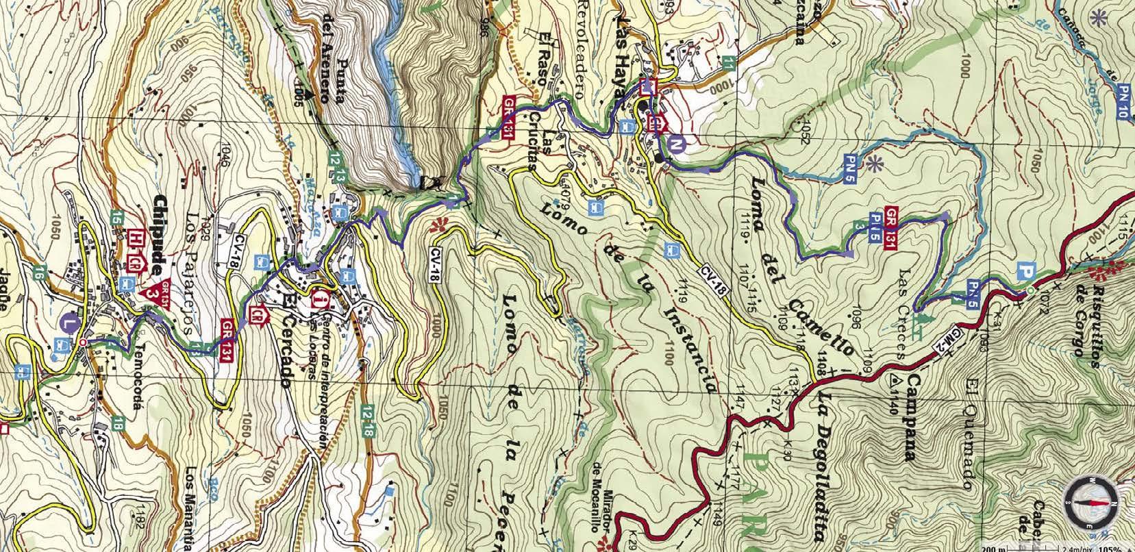 ens decep una mica, ja que no és un mirador gaire espectacular, al qual hi han bastit una petita plaça de pedra. Comencem a baixar en mig de boscos, un tros més avall deixarem el GR-131 i agafarem el PN 14 que anirem seguint fins a arribar al pàrquing de El Contadero a la GM-2.
