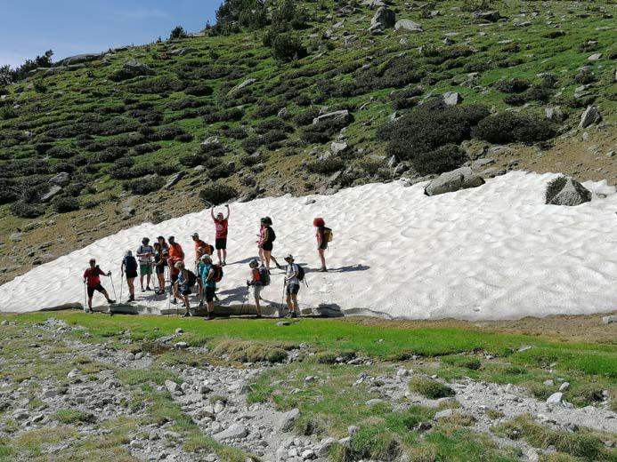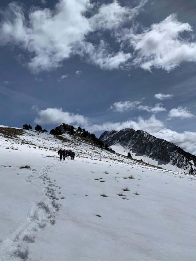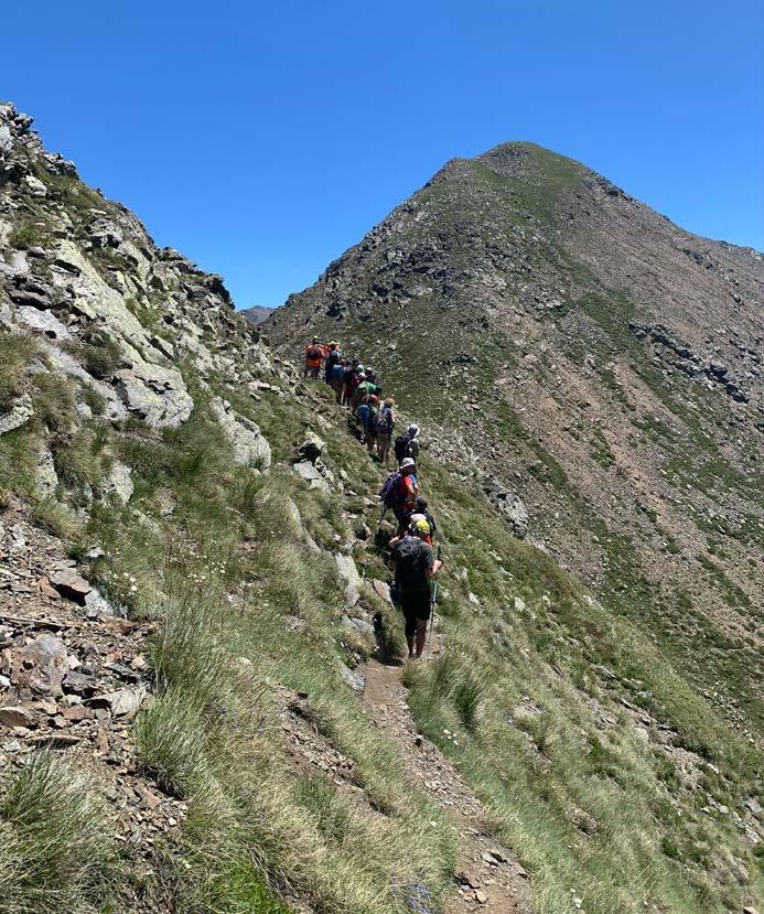 El dissabte 9 de juliol el cel torna a ser ben ras i la calor és encara més forta. Després de fer nit en diferents indrets, ens concentrem al poble andorrà de El Serrat i seguim fins a les cabanes del Castellar. Allà comença l’ascensió al pic de Font Blanca (2903 m), la nostra fita. Som 40 de colla, de les seccions de Muntanya i Muntanya Jove, i en Marc Pons, l’Albert Rubirola i en Kim Agustí intenten organitzar la colla. A 2/4 de 10 del matí, sota una temperatura de 17º, emprenem la caminada.