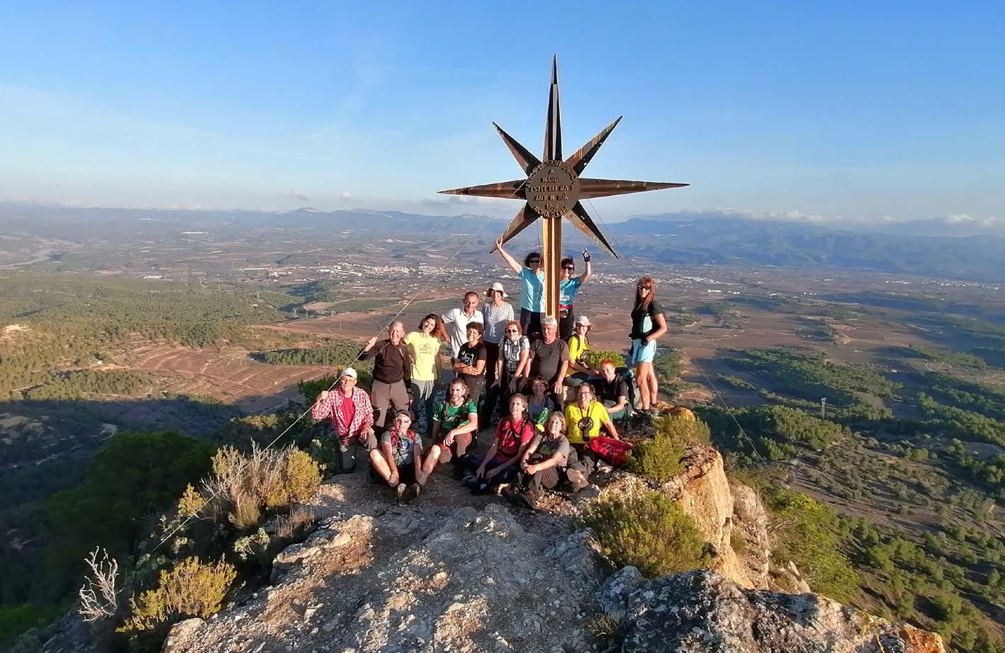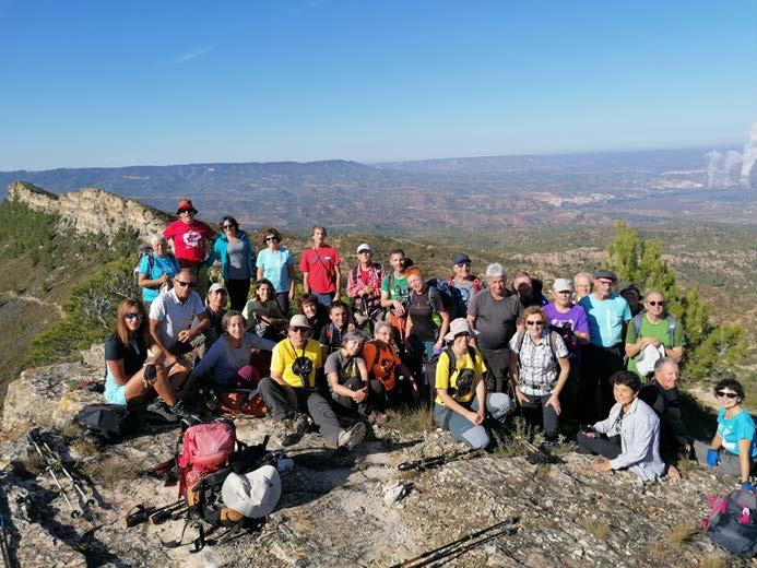 El camí convida a seguir-lo, però hem d’escollir un altre corriol que s’enfila, molt dreturer, caire amunt, cap a uns cims encara coberts per la boira. Unes cadenes fan més segur el pas en algun punt. Aviat el sol desfà els núvols, gaudirem d’un dia esplèndid. La colla s’estira mentre ens acostem a la nostra fita, la punta d’Aguilar (492 m). La trepitgem poc abans de les 12 del migdia i hi fem una llarga aturada, tot contemplant l’immens panorama i les capricioses formes de la fumera de la central d’Ascó.