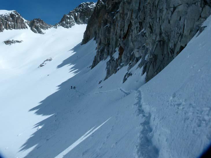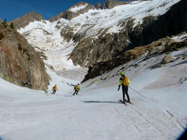 Fem la baixada per la glacera fins a l'ibon de Barrancs, remuntem al coll de Salenques, baixem vorejant el pic Russell fins a uns 2550 m, ara llarga travessia de puges i baixes sempre amb pells procurant optimitzar les traçades, travessem l'estany Cap de la Vall i arribem a la collada Soubiron 2677 m, al S de l'estany Negre i a W de la tuca Anglios, d'on ja veiem l'estany de Cap de Llauset i el refugi, a la canal de baixada li toca el sol de capvespre i arribem a taula a hora habitual de refugi (encara tenim temps de dutxa ràpida).