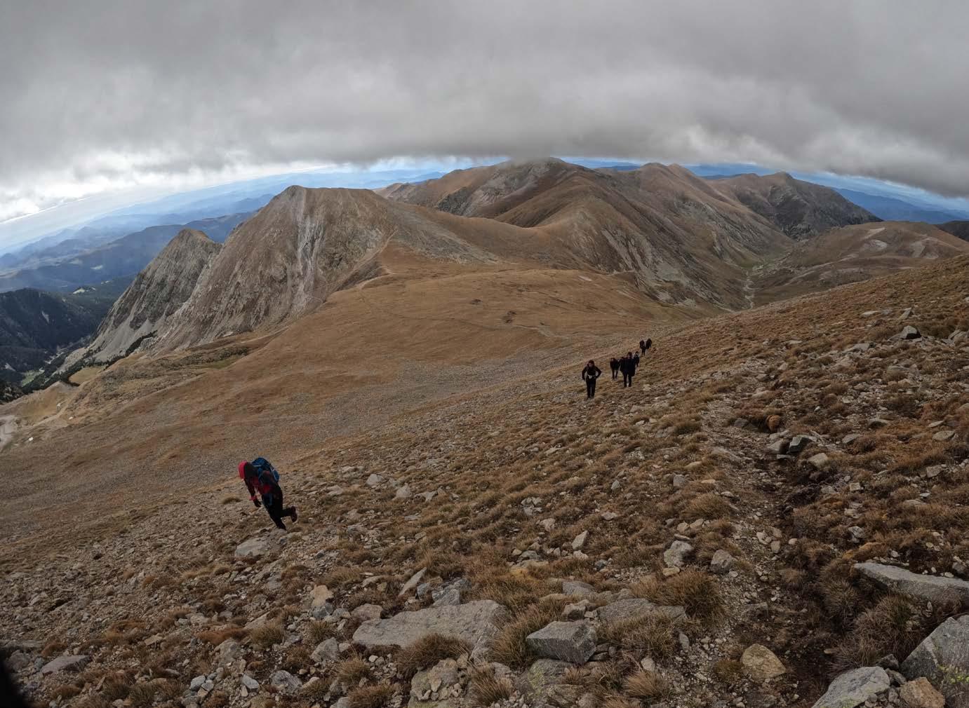 Al mig de la pujada veiem unes pedres que ens tallen el vent i ens refugiem allà per agafar forces amb un bon esmorzar. Un cop ben esmorzats continuem pujant fins a arribar al coll. A partir d’allà, agafem un camí que passa per la carena i