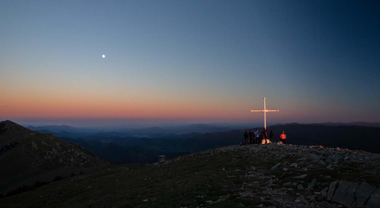 Fa un dia esplèndid. Però el dia ja és més curt i cal que ens posem les piles si no volem que se’ns faci de nit. I a poc a poc però amb pas ferm, seguim caminant amb aquella preciosa llum daurada que fa el sol quan ja va més avall, fins que ens plantem al cim del Taga. Des d’allí contemplem una meravellosa posta de sol i fem una mica de “postu” aprofitant aquest cel tan bonic que tenim al davant. Comencem a baixar cap al refugi de Sant Jordi, ja en hora blava i arribem a baix just quan desapareix l’últim rastre de llum del sol.