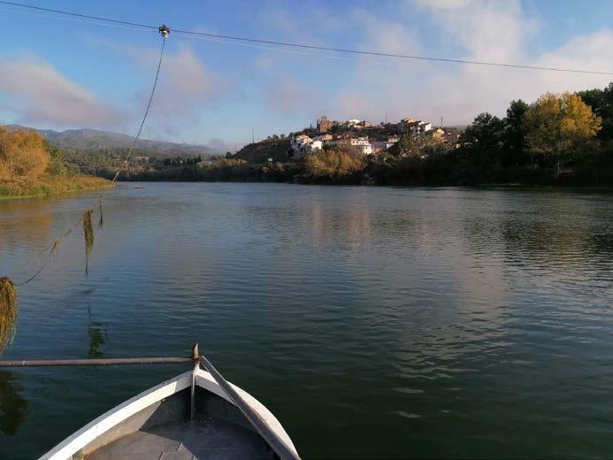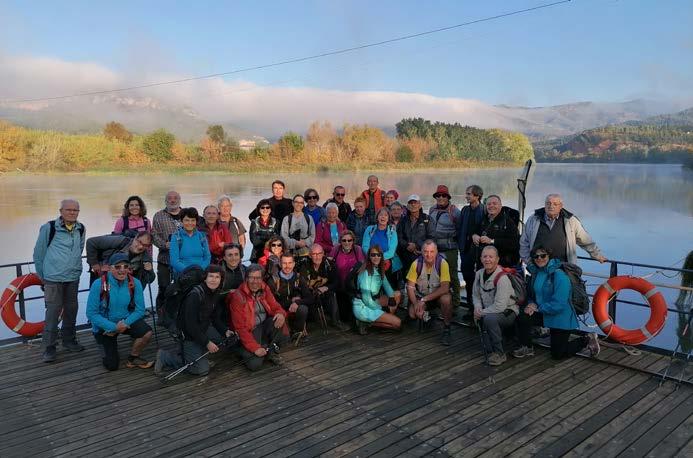 El diumenge tornem a la rotonda de Garcia i a ¾ de 9 comencem a caminar. Llueix el sol, però la boira cobreix els cims i l’Ebre fumeja. Tenim concertat el pas de barca, un dels plats forts del cap de setmana, per les 9 del matí; un servei excel·lent i molt recomanable, encomanat amb antelació. Aviat les càmeres fotogràfiques també fumegen, després de reproduir una i mil vegades un moment màgic de la nostra llarga travessia.