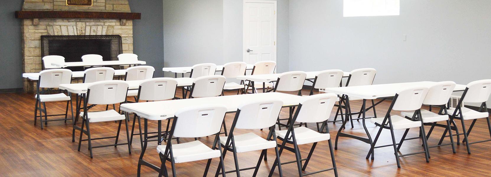 The Scout Lodge is a stand-alone facility with automated entry. Behind the facility there is a small patio with access to a playground. This facility also has a kitchenette which includes a refrigerator, sink, and microwave.