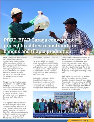 PRDP-BFAR Caraga convergence project to address constraints in bangus and tilapia production PRDP Caraga’s I-PLAN component, through its Sub-component supporting the implementation of the Agriculture and Fisheries Modernization and Industrialization Plan (AFMIP), launched its convergence project with the Bureau of Fisheries and Aquatic Resources (BFAR) Caraga on December 5, 2023, at the Masao Technology Outreach Station, Butuan City. The partnership aims to produce an alternative fish feed for bangus and tilapia using raw materials readily available within the region. This locally-produced feed will address high input costs in bangus and tilapia production, making affordable feeds more accessible for small-scale fisherfolks in Caraga. “The high cost of feeds continues to be a challenge in aquaculture. Through this study, we hope to be able to introduce alternative feeds that can easily be formulated by fisherfolks using resources available in their immediate environments,” says Senior Aquaculturist and Masao Technology Outreach