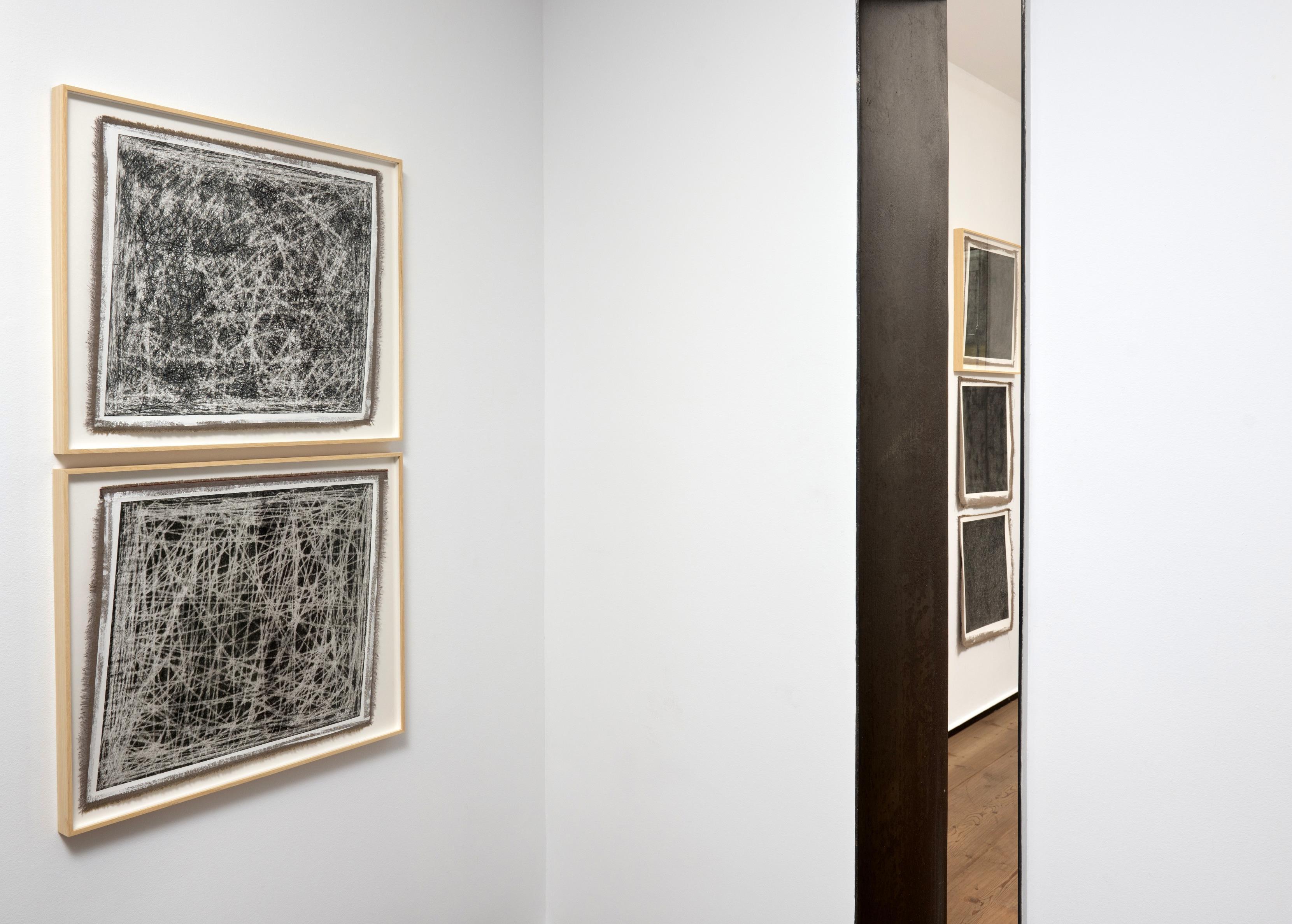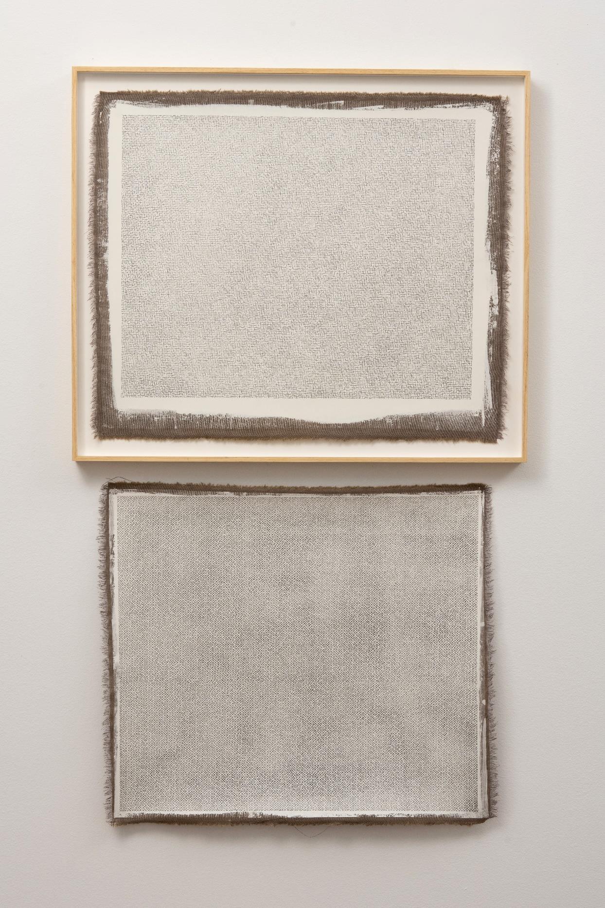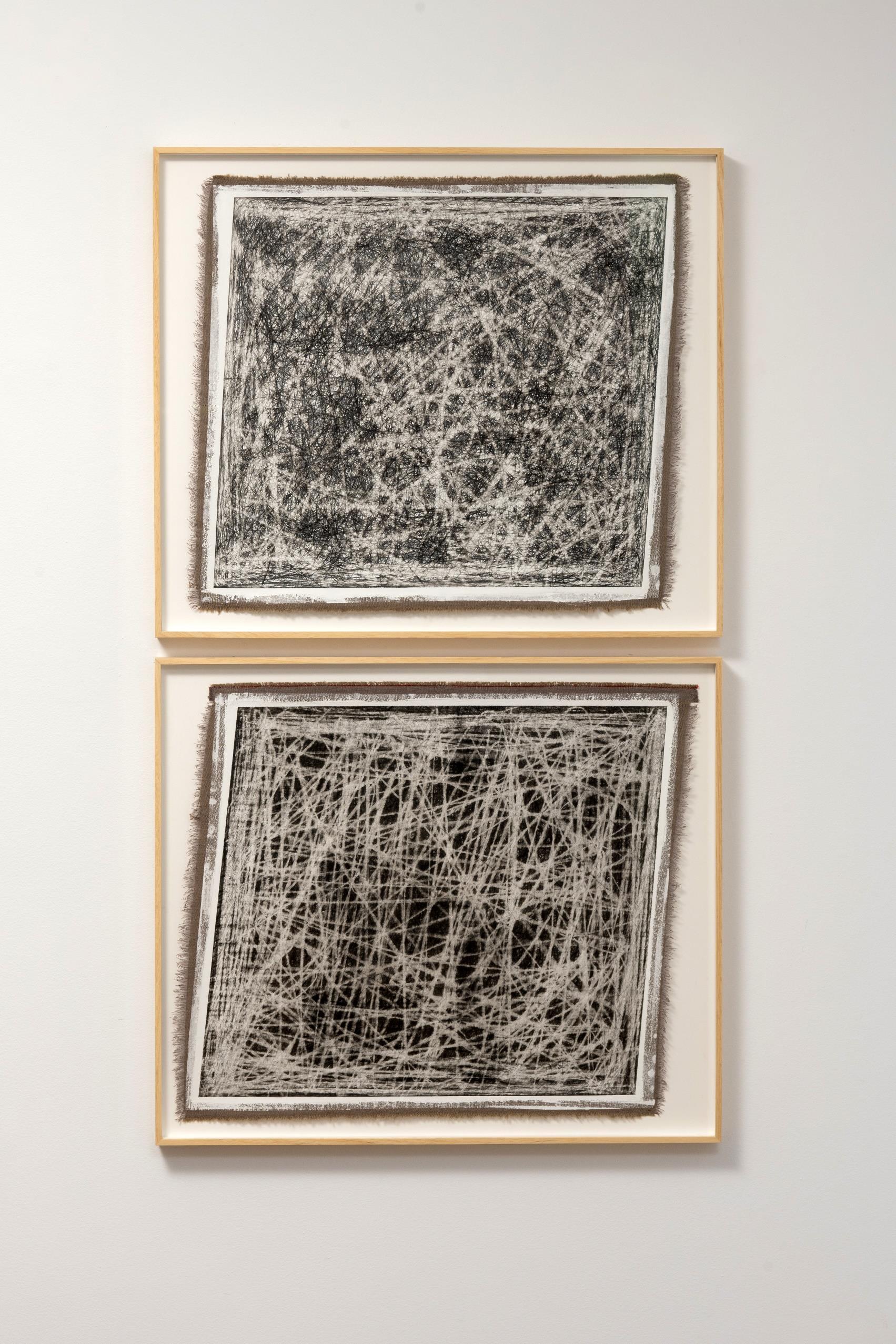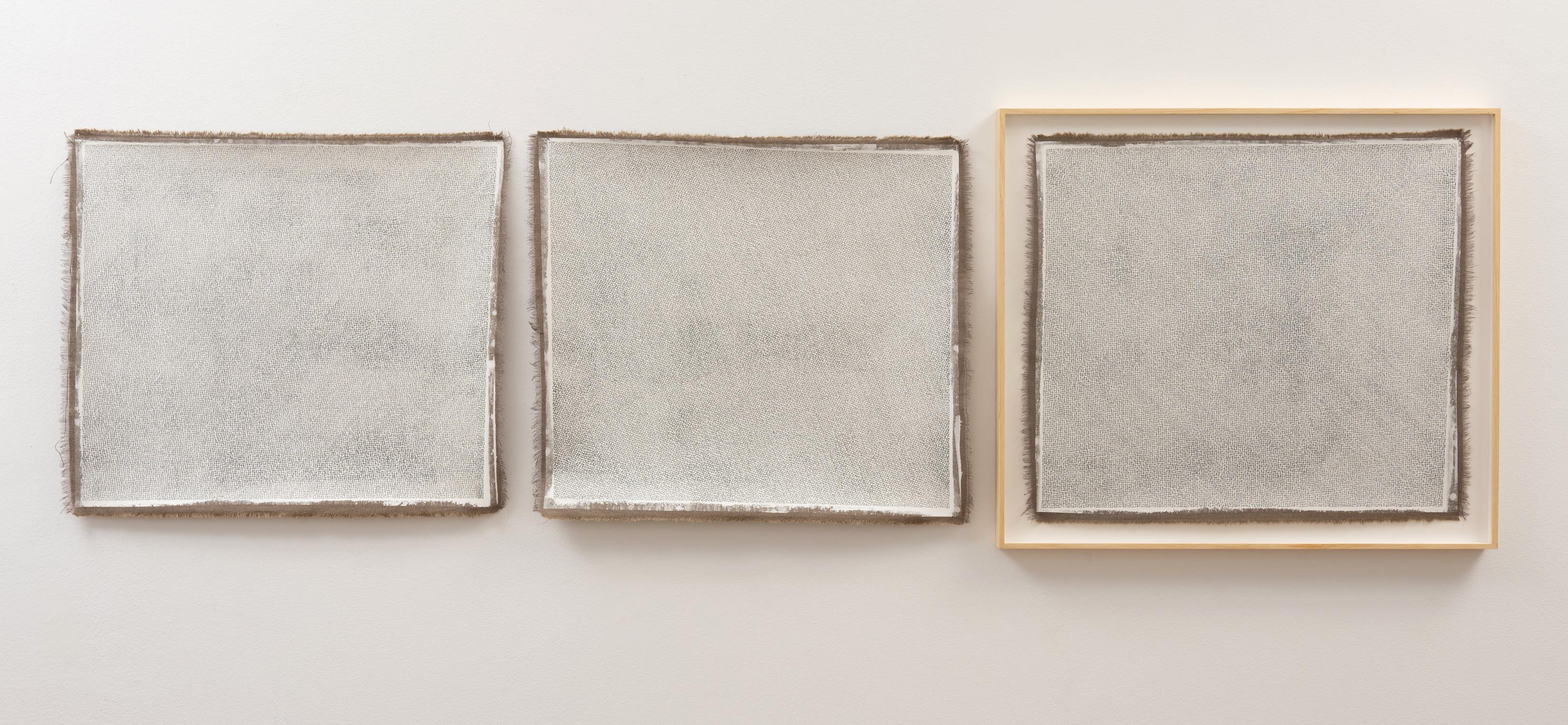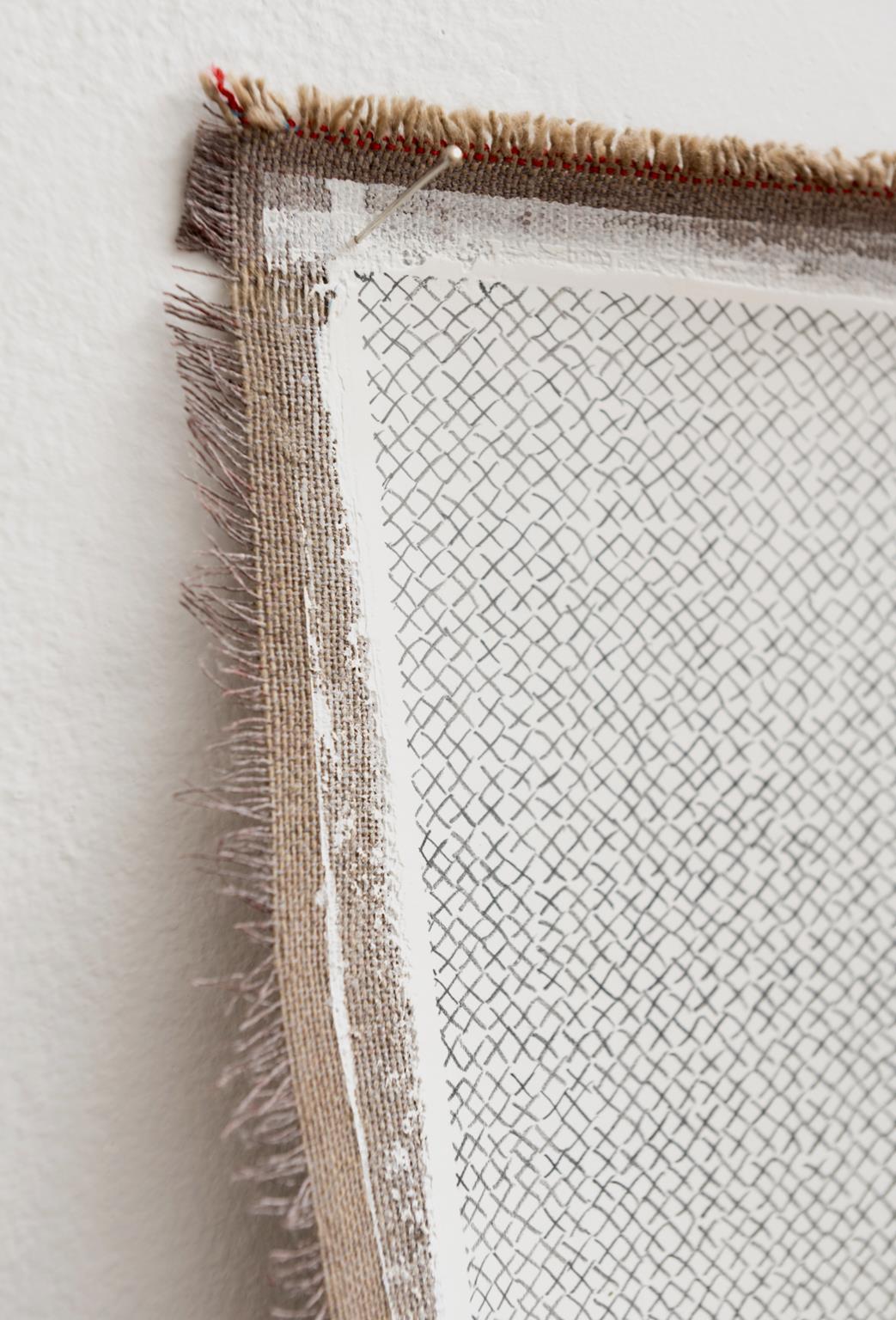 Yo aquí no pinto nada. Todo está dibujado con el hilo de grafito que deja el lápiz a su paso. Una vez cubierta la tela con la imprimación blanca, vuelvo a dibujar la trama del tejido que sirve de soporte a la obra. La urdimbre geométrica se torna orgánica por la minuciosa repetición llena de errores y diferencias en cada gesto. La maraña que surge refiere directamente a superficies y temáticas de la naturaleza, no por tener una relación directa con imágenes preestablecidas de lo real, sino más bien por recrear los modus operandi que animales, plantas y otros fenómenos usan para modificar su entorno.