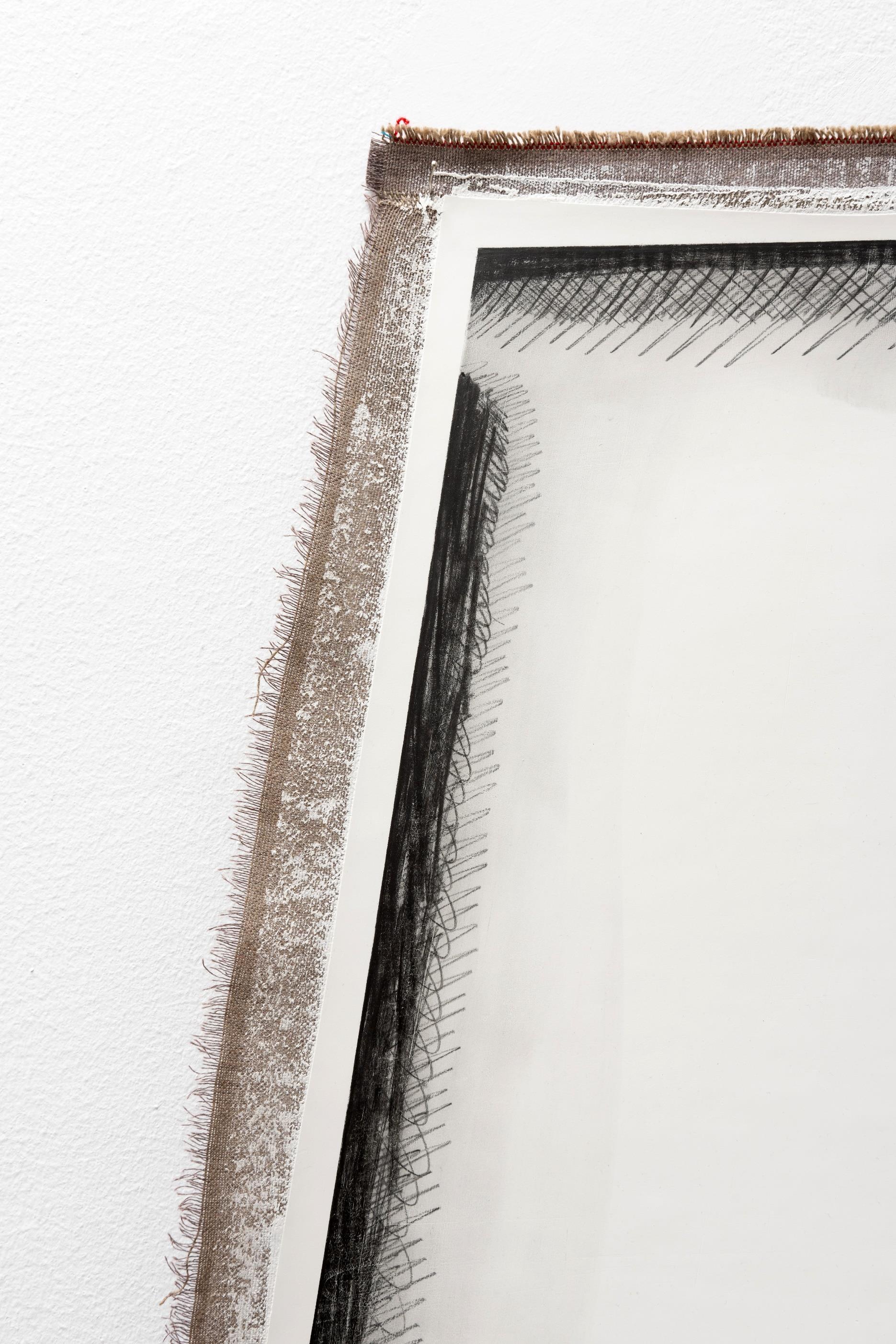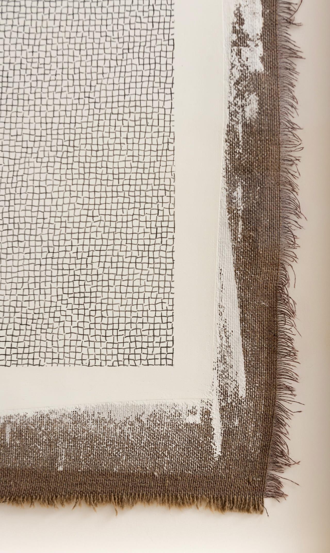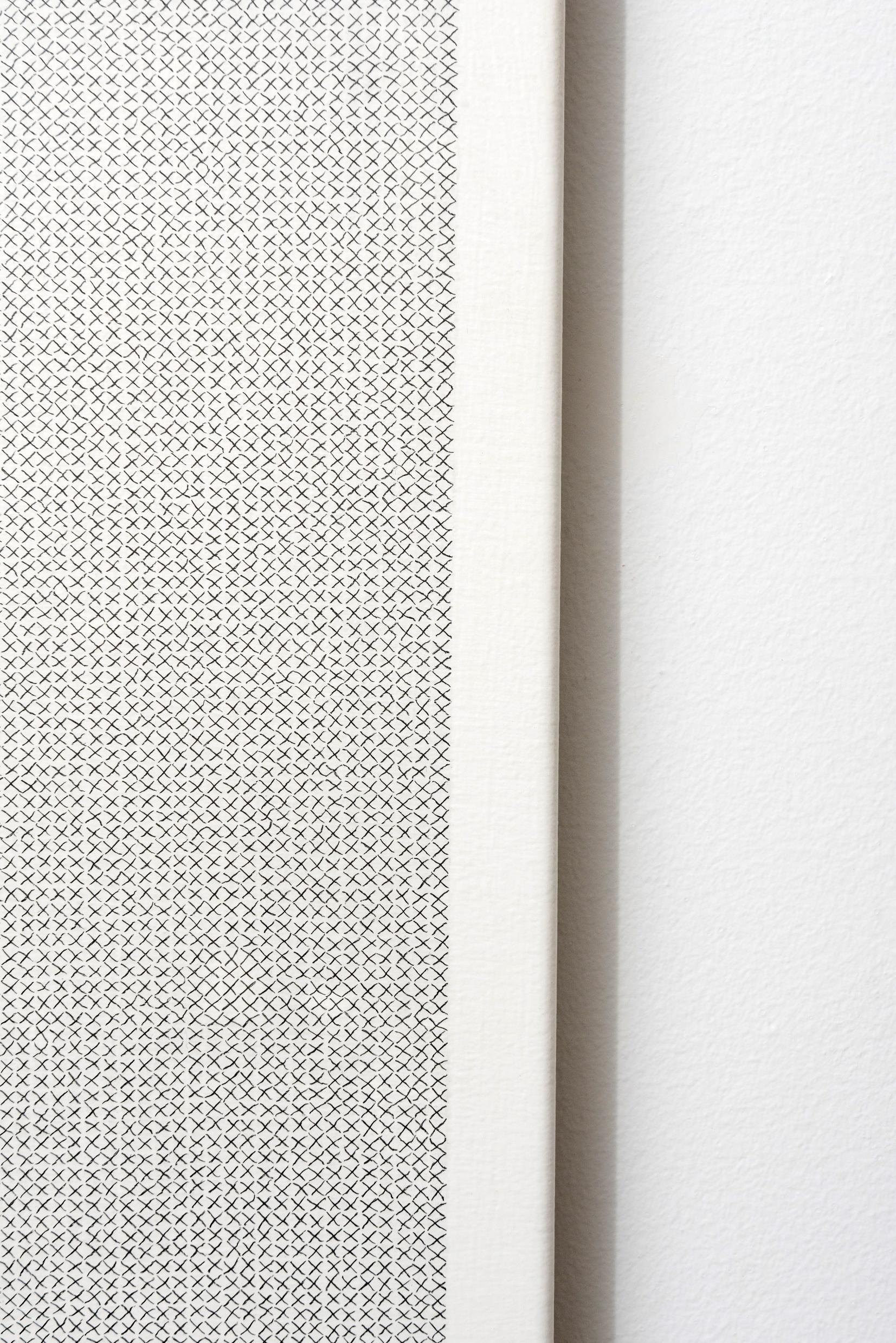 I don't paint anything here. Everything is drawn with the thread of graphite that the pencil leaves in its wake. Once the fabric is covered with the white primer, I once again draw the weave of the fabric that supports the work. The geometric warp becomes organic due to the meticulous repetition full of errors and differences in each stroke. The tangle that emerges refers directly to surfaces and themes in nature, not because it has a direct relationship with pre-established images of reality, but rather because it recreates the modus operandi that animals, plants and other phenomena use to modify their environment.