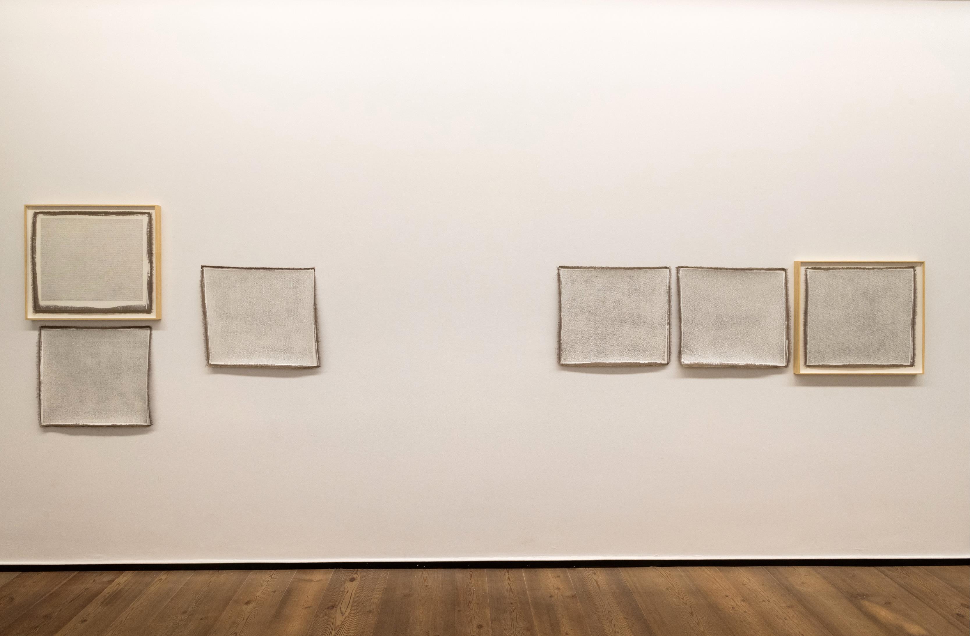 Ahora parece por fin comprender que éstas convierten cada obra en única, dando lugar a una magnífica selección de lienzos sin bastidor donde con lápices de colores, ceras y grafito sobre una capa de imprimación va componiendo distintas series con motivos como cruces, líneas, cuadrículas y otras composiciones.