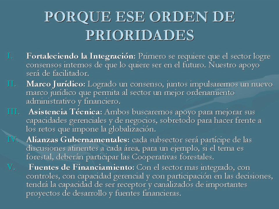 Para nosotros, reconociendo que es un eje estratégico para combatir la pobreza en Honduras, nosotros estamos proponiendo el fortalecimiento de la integración del sistema de cooperativas, es decir que se avance en el consenso interno, porque desde allí debe nacer la propuesta para el desarrollo y la visión del sistema de cooperativas También nosotros proponemos el apoyo a través de la asistencia técnica con programas que mejoren las capacidades gerenciales y de negocios, para hacer frente a los retos que impone a lo que está por venir como es el Tratado de Libre Comercio. Tenemos que
