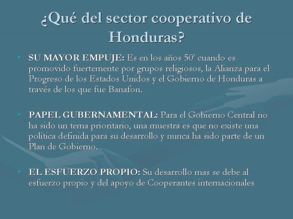 Sin embargo, todos los esfuerzos del cooperativismo han sido esfuerzos propios del mismo sistema del cooperativismo. Los gobiernos prácticamente han hecho muy poco por reforzar el marco constitucional, por reformar la estructura organizativa, por el apoyo financiero y realmente este es un