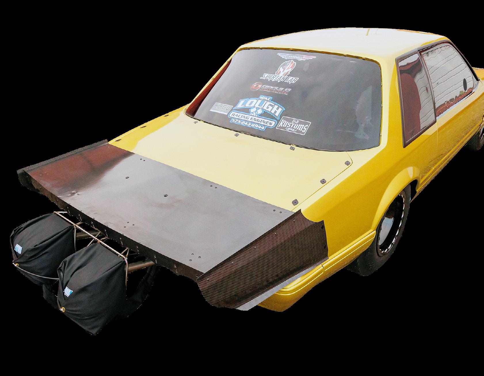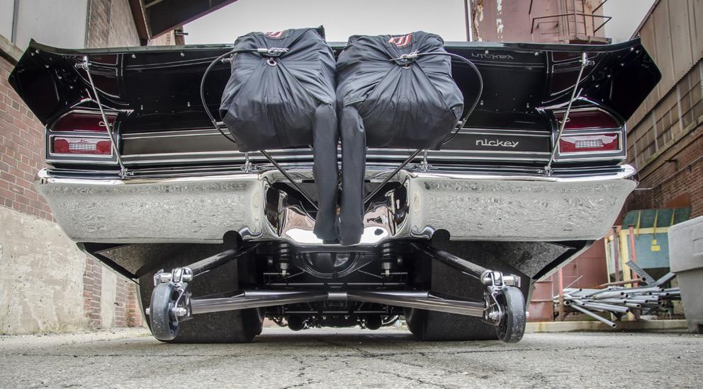 Mark had some custom work done to the car including wing, wheelie bars and parachute, but the fender-exit exhaust was the most challenging.